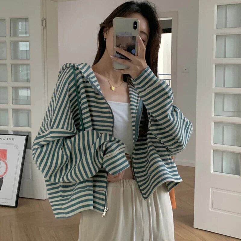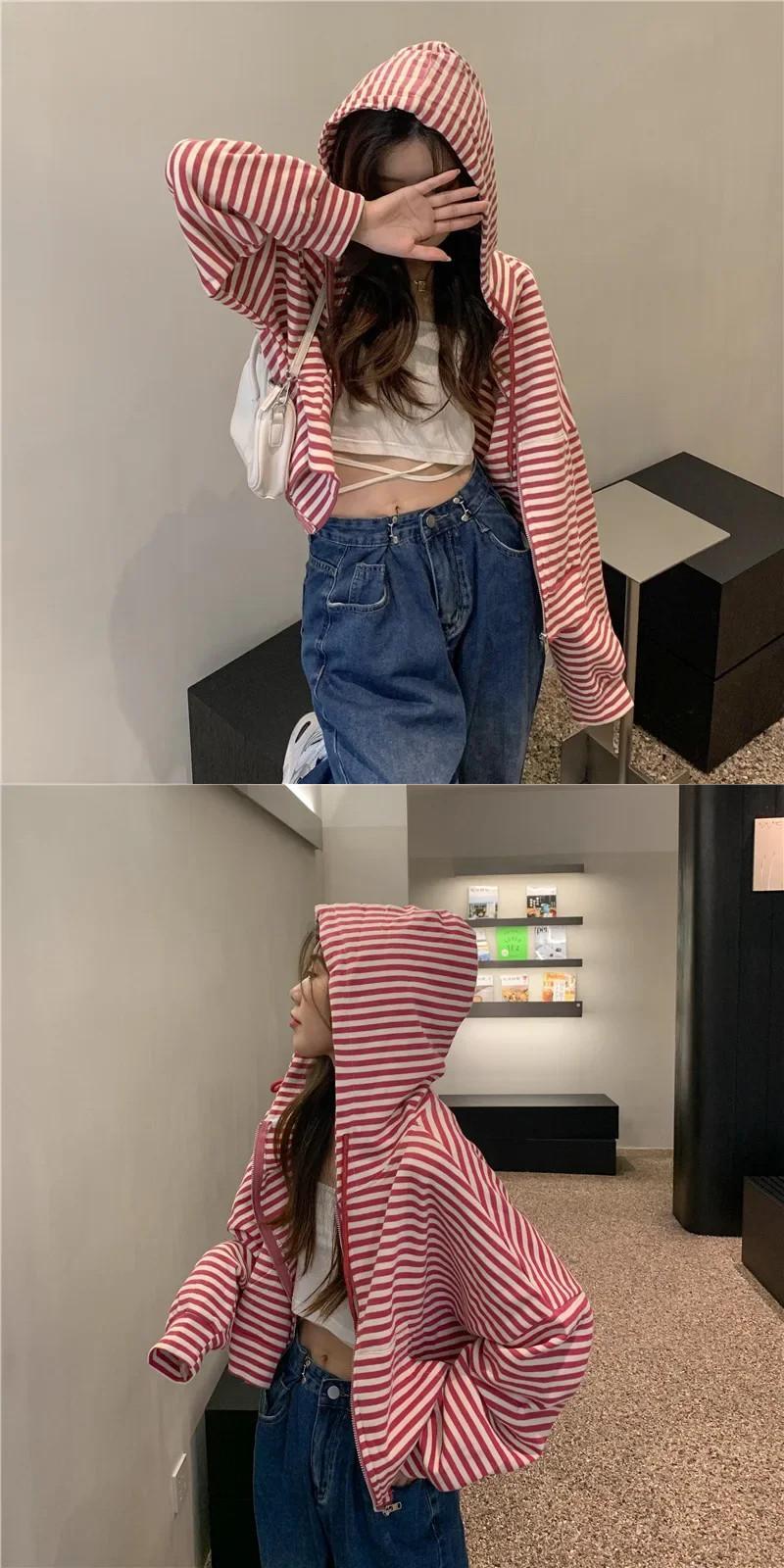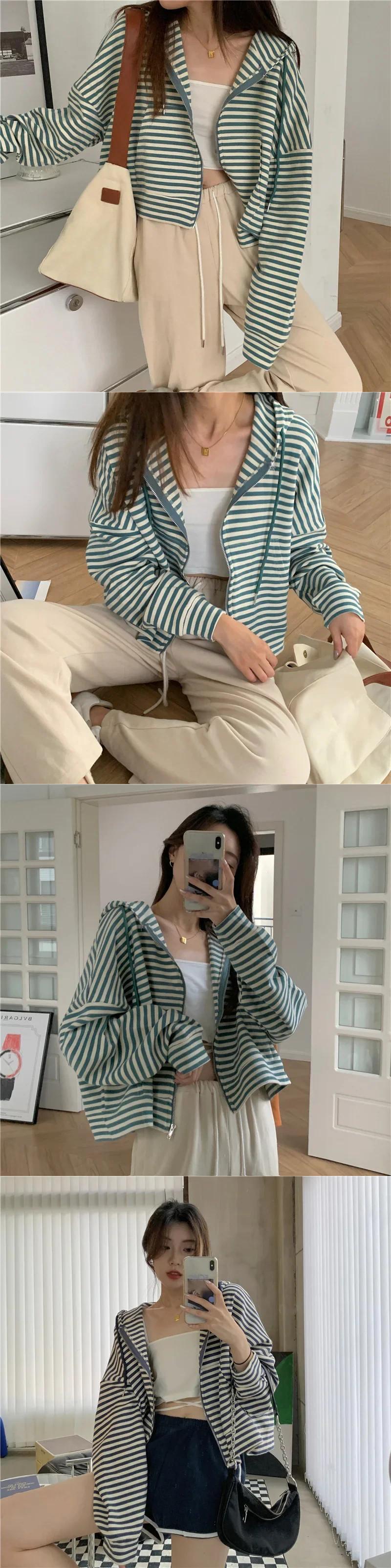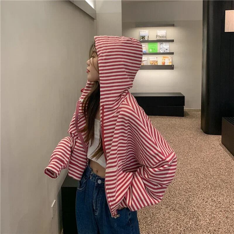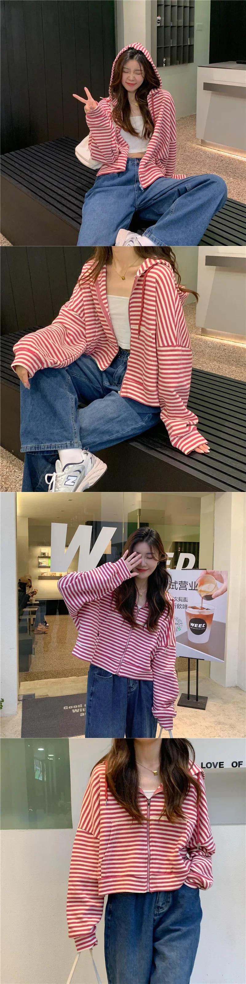 スタイルパーカーガールズストライプジップアップトップ長袖特大フード付きトレーナージャケットショートコート ロング