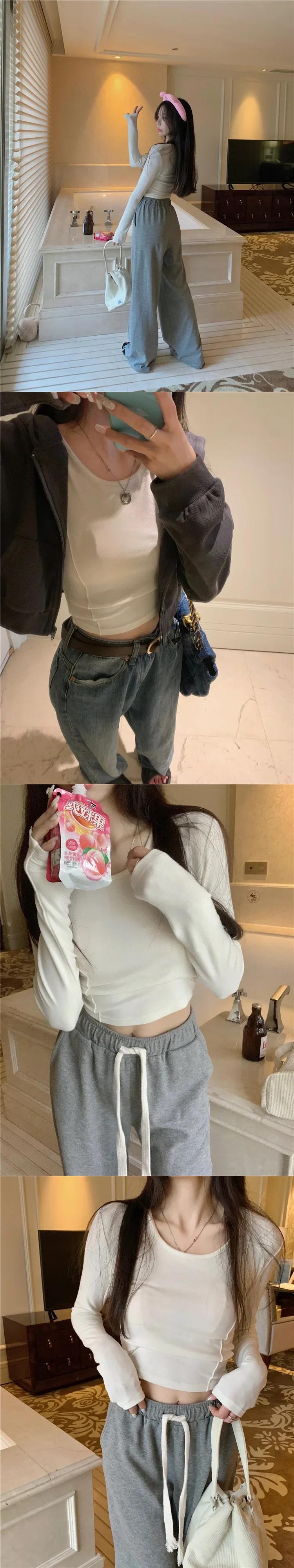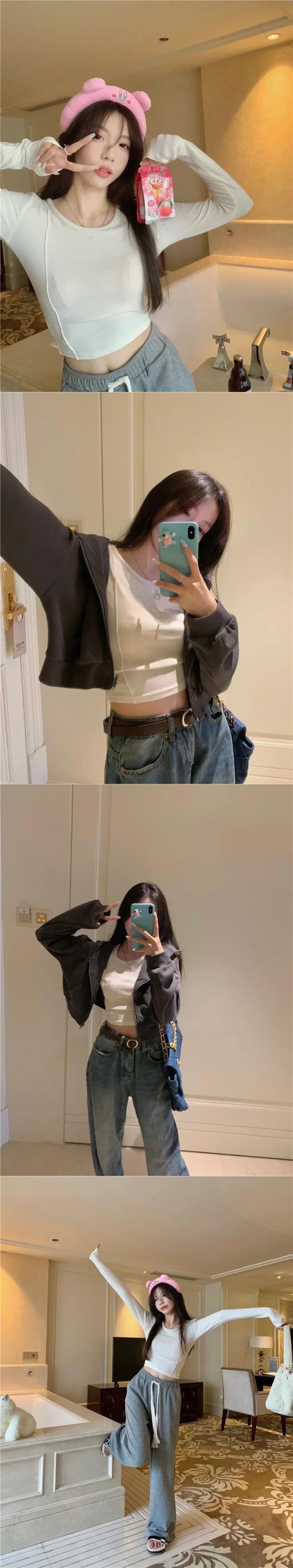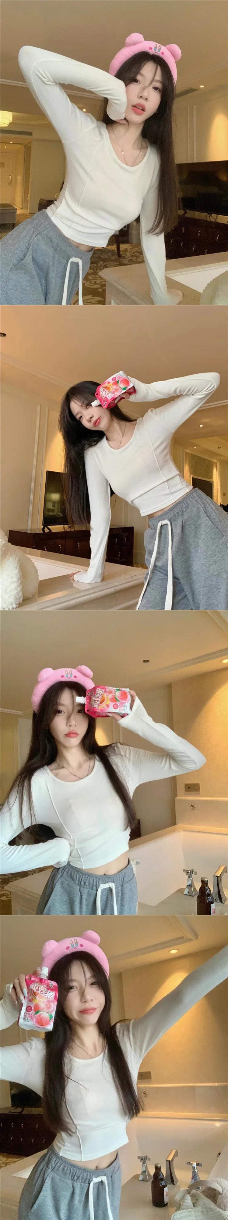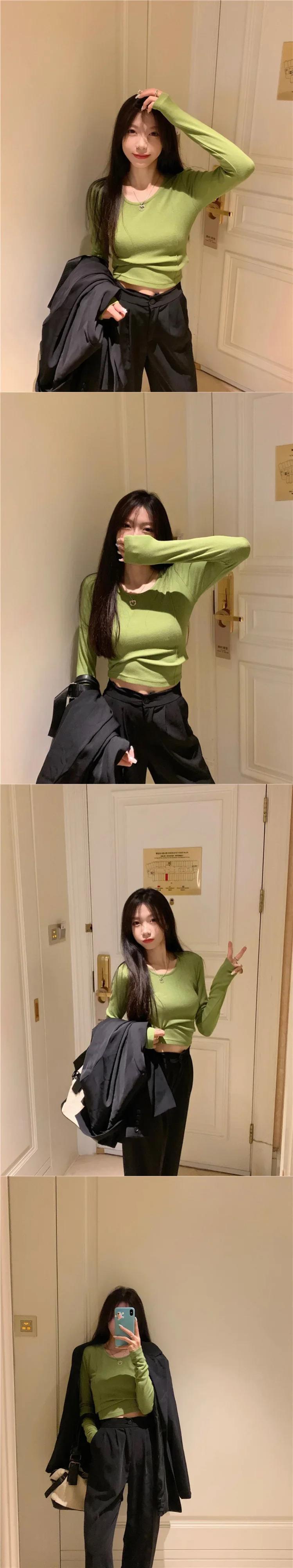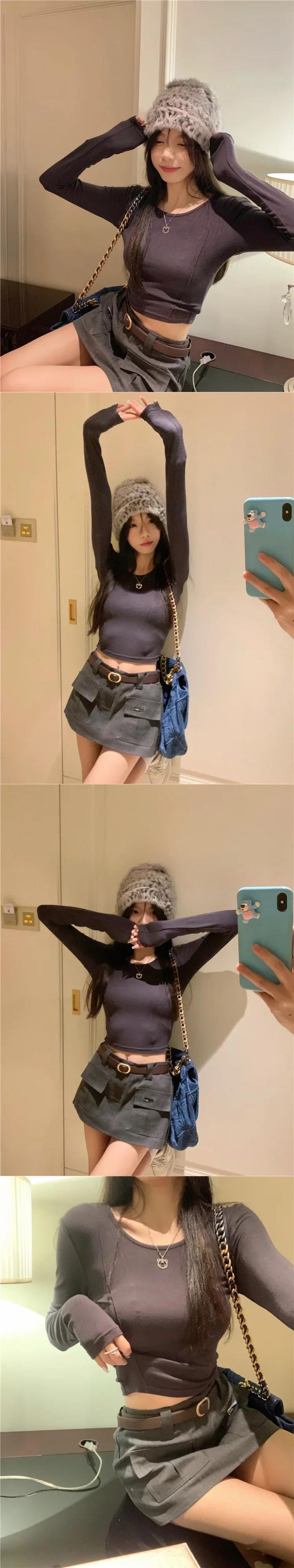 2024 春 O ネック Tシャツガール不規則裾スリム y2k クロップトップス原宿長袖ボトムシャツ ロング かわいい スプリング 春物 Oネック ソリッドカラー