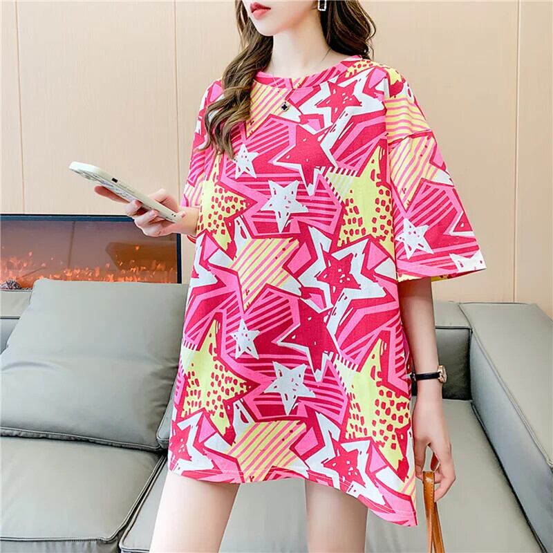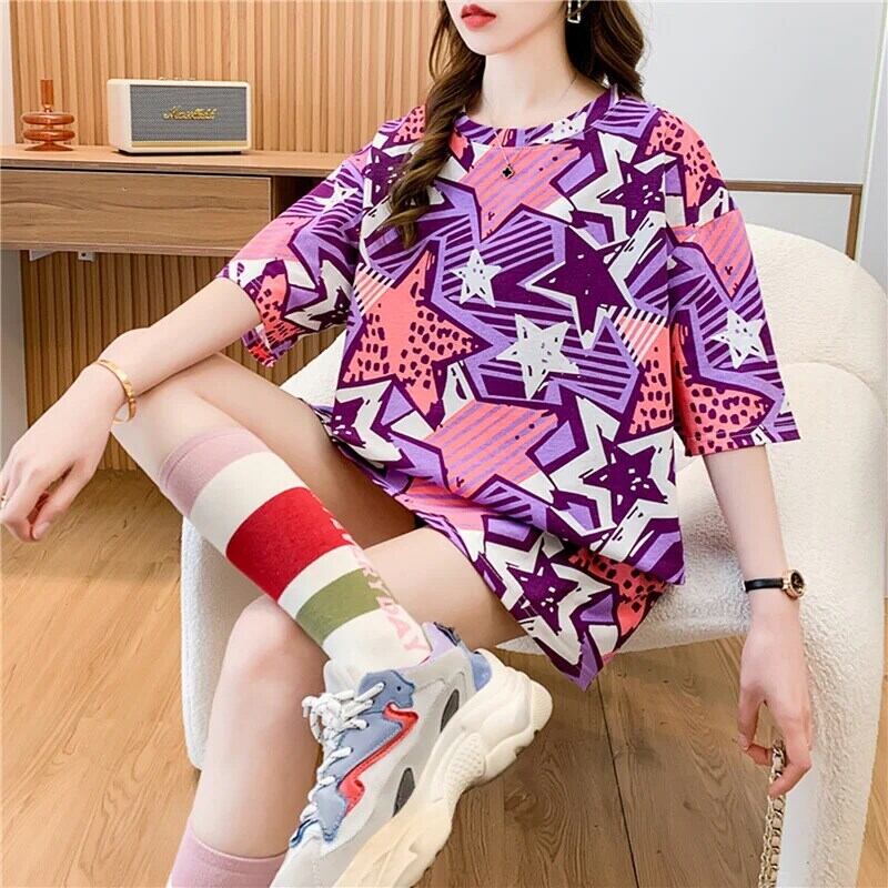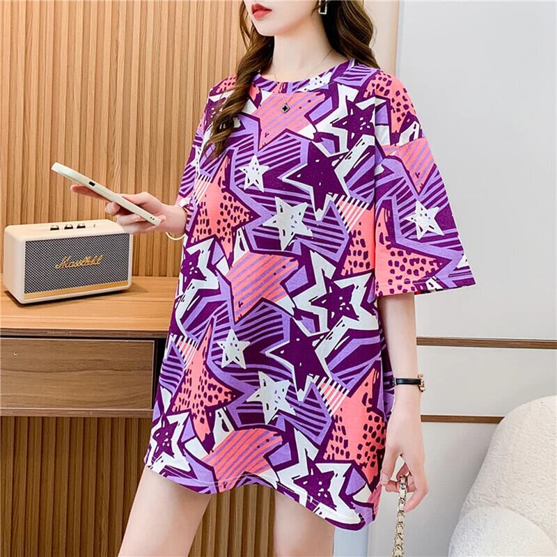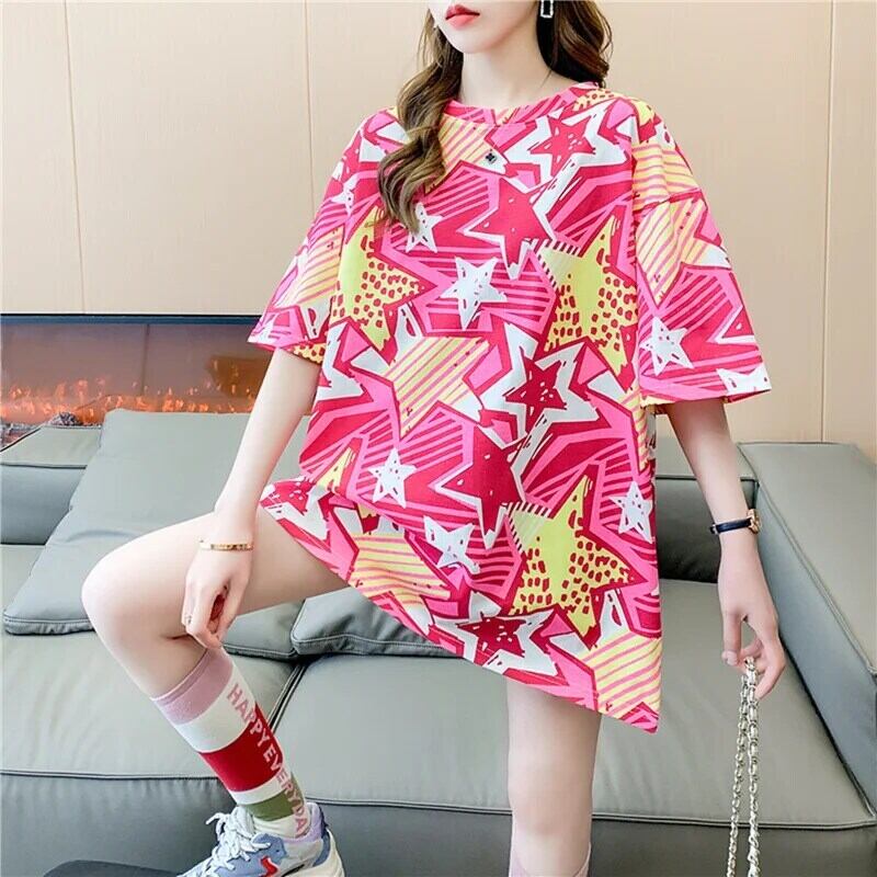 夏特大ミディアム丈 tシャツピンクパープルスタープリント y2k トップ原宿半袖 Tシャツストリート ショート ハーフスリーブ かわいい サマー 夏物