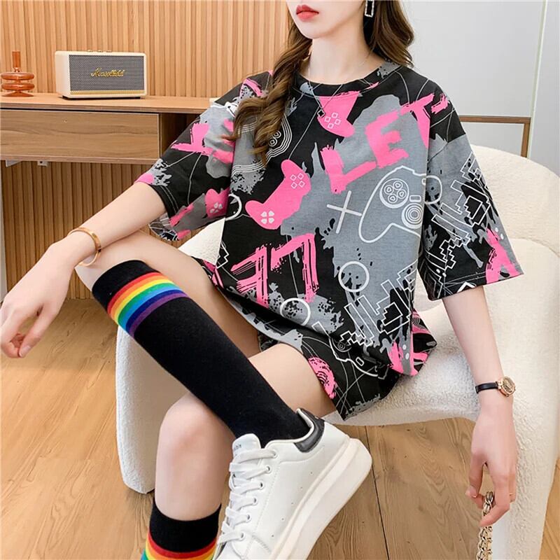 2024 夏ピンク手紙半袖 Tシャツ特大韓国グラフィック y2k トップスロング Tシャツ原宿カップル ハーフスリーブ かわいい サマー 夏物