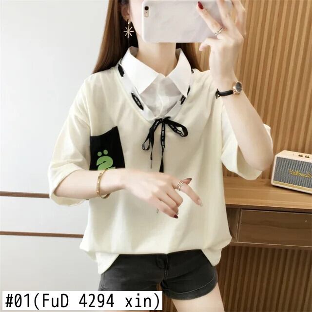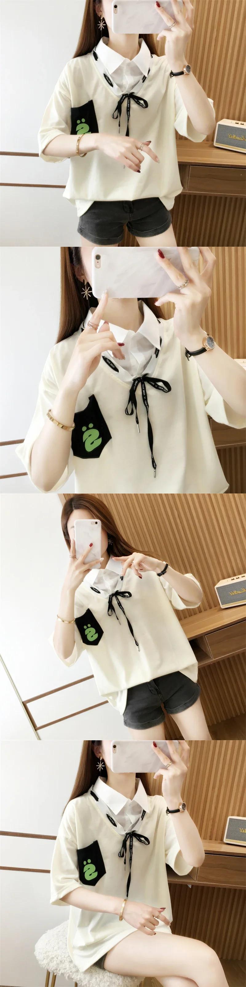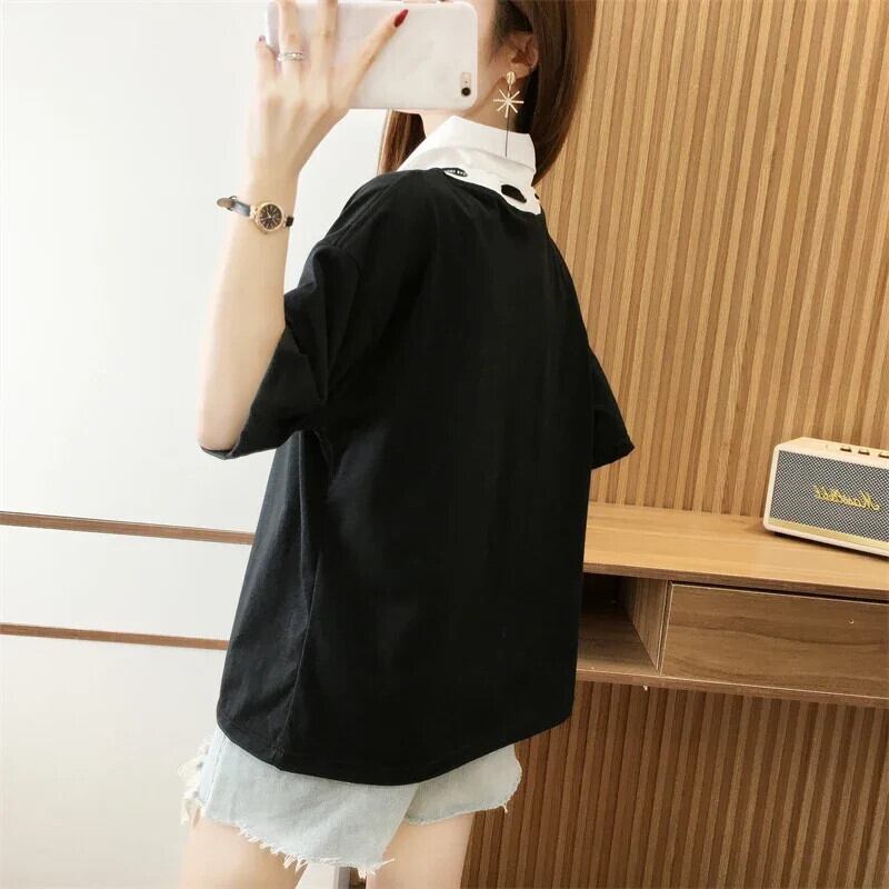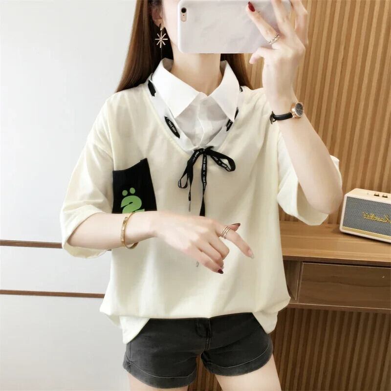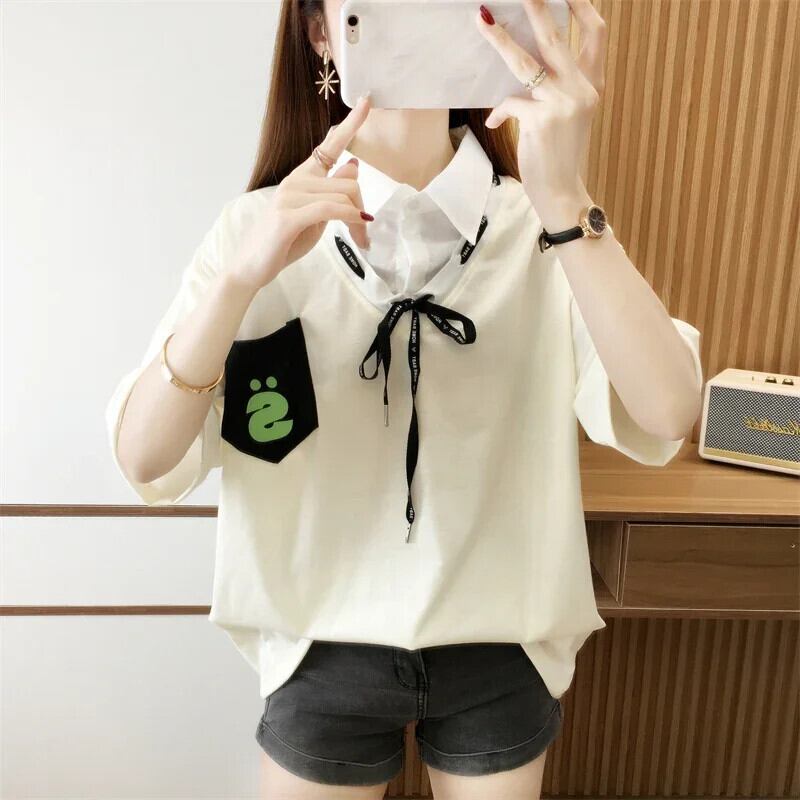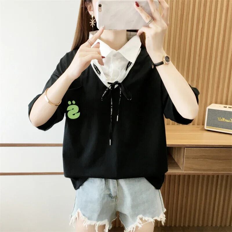 韓国レタープリント偽二枚 Tシャツ原宿夏綿ルーズ tシャツ半袖ターンダウン襟 y2k トップス ショート コットン ハーフスリーブ かわいい サマー 夏物