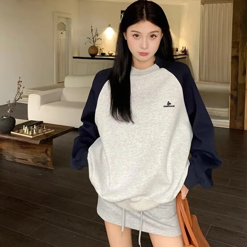 春秋パーカーカラーブロック特大トレーナーレター長袖トップ原宿プルオーバーストリート ロング かわいい スプリング 春物 オータム 秋物