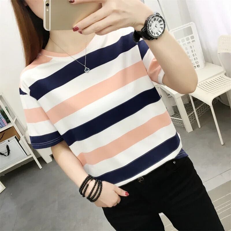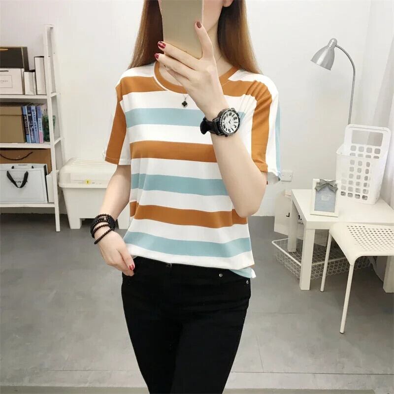 原宿カラーブロックストライプ Tシャツレディース Tシャツカジュアルルーズ半袖シャツ夏 O ネックレディース かわいい サマー 夏物 Oネック