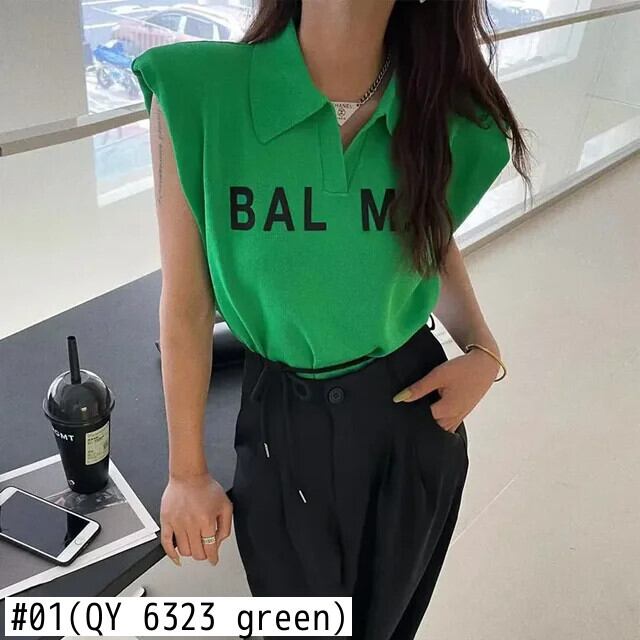 2024 夏ポロ襟ジャンパーセーターニットセータープルオーバー手紙スリムストリートノースリーブ肩パッドベストトップ サマー 夏物