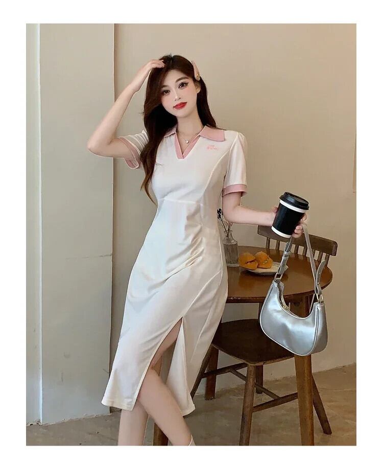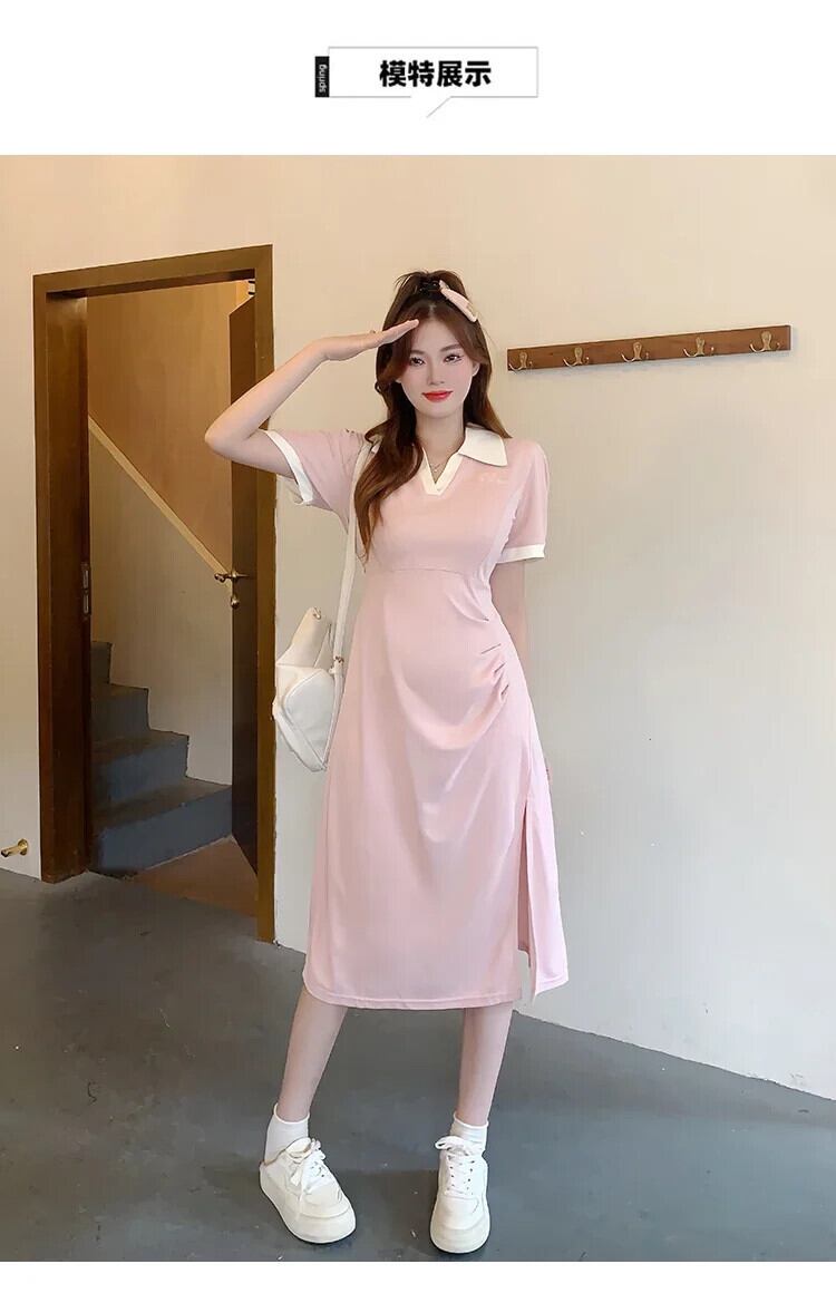 Aラインドレス韓国夏プレッピースタイルドレスvネックウエストソリッドベントマキシvestidosエレガントパラmujer サマー 夏物 ソリッドカラー