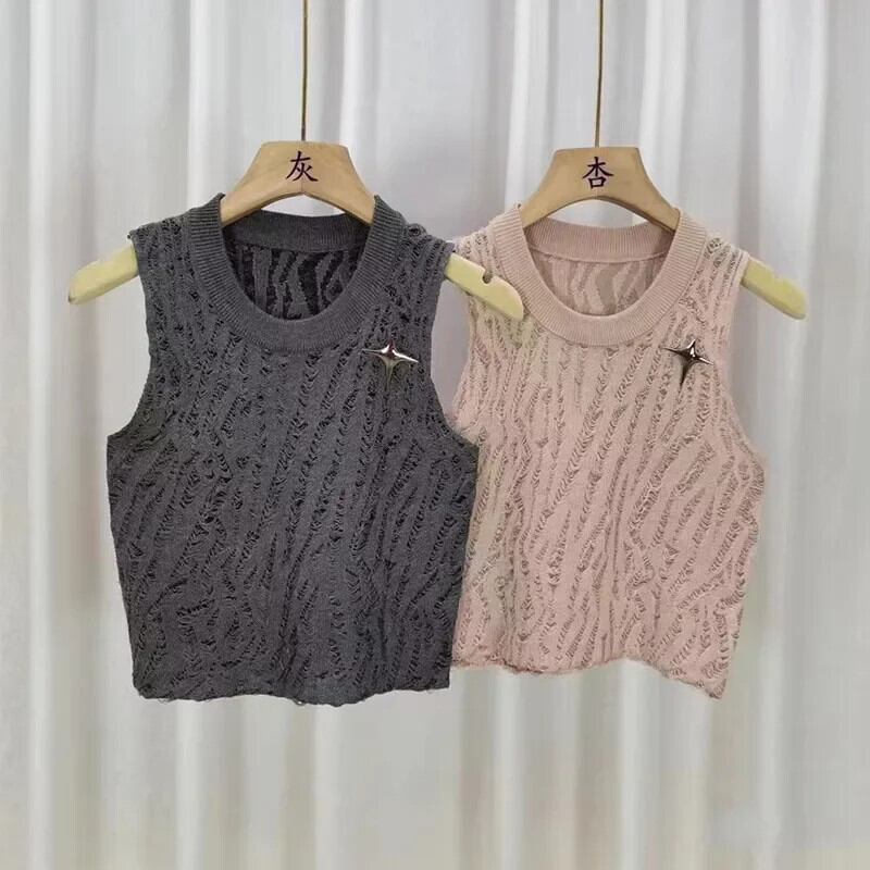 夏ノースリーブニットアメリカンゴススリムニットベストクロップトップスセクシーストリートベストセーター サマー 夏物 ソリッドカラー