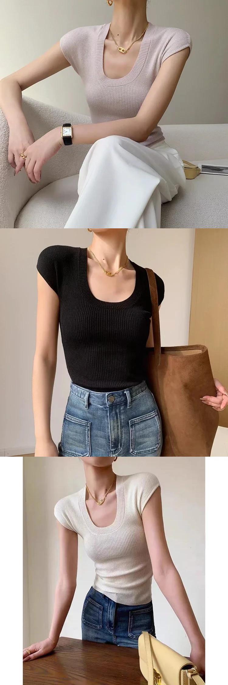 ファッション O ネック半袖プルオーバー夏ベーシッククロップドニットセーターシックオールマッチトップスセーター ショート ハーフスリーブ サマー 夏物 Oネック ソリッドカラー