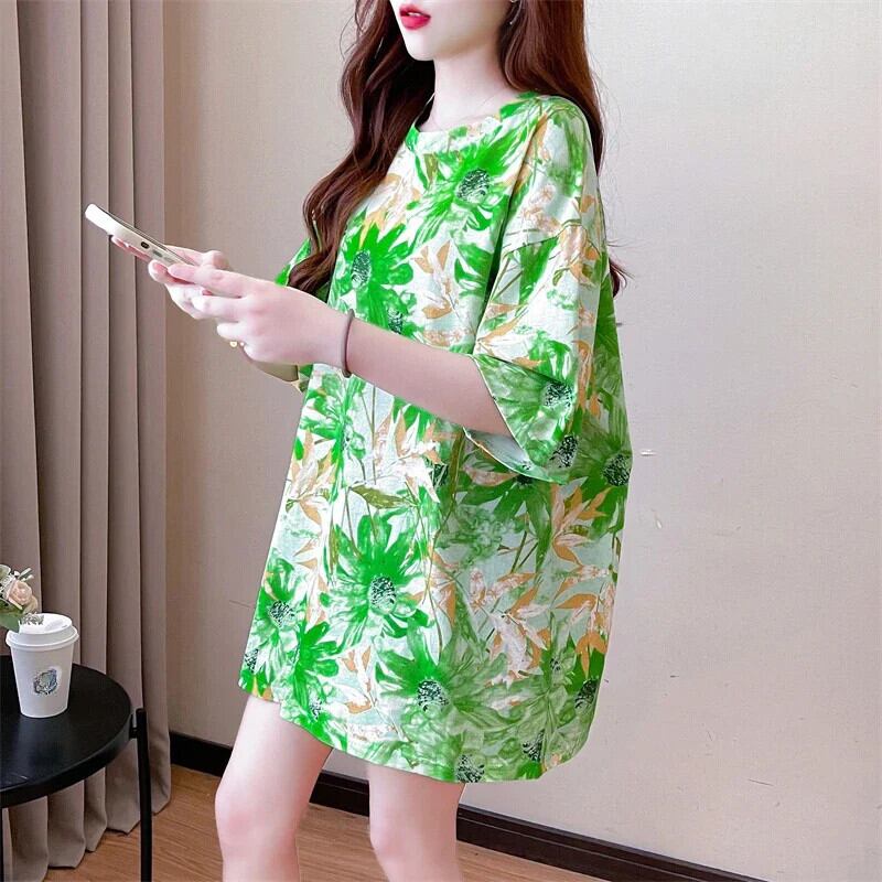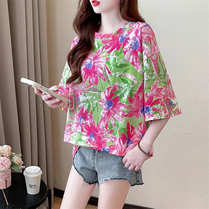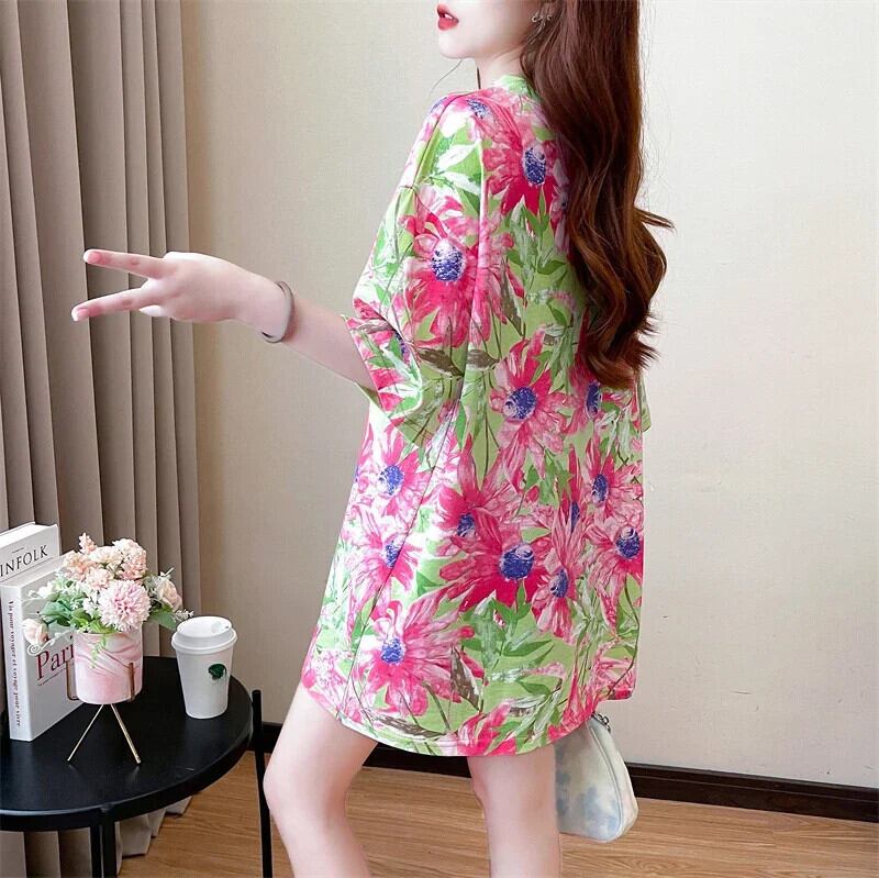 韓国グラフィック y2k トップスロング Tシャツ夏フラワープリント半袖 Tシャツ特大原宿友人 ハーフスリーブ かわいい サマー 夏物 フラワーデザイン