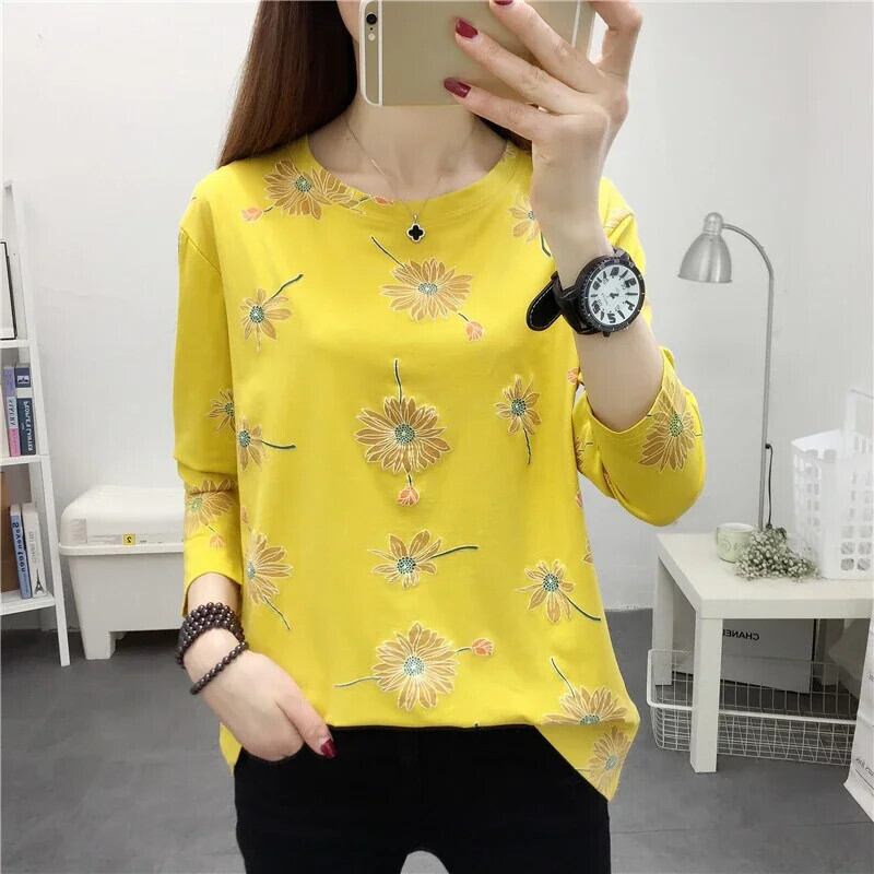 2024 春秋黄黒スリムベーシック Tシャツトップ原宿フラワープリント長袖 Tシャツ O ネックトップス ロング ブラック かわいい スプリング 春物 オータム 秋物 Oネック フラワーデザイン