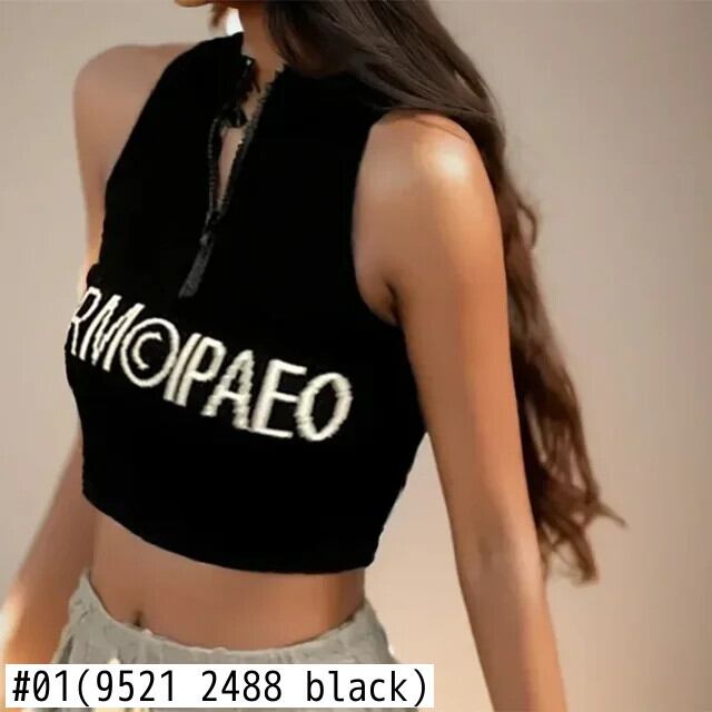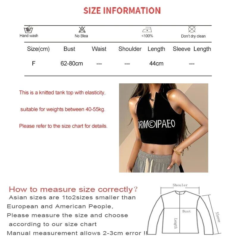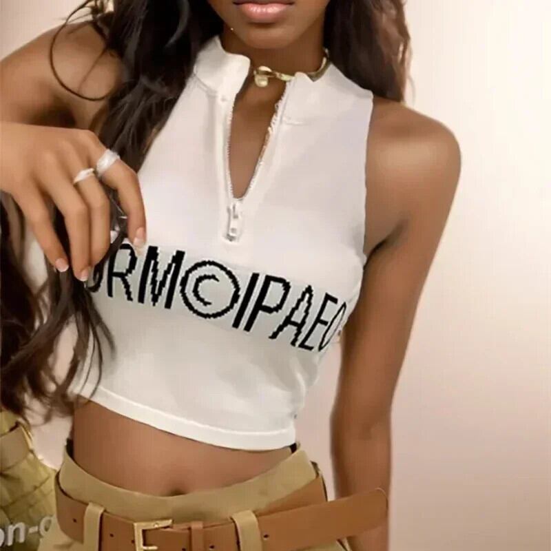 2024 春夏ファッションレタープリント黒タンクトップジッパークロップトップスニットノースリーブ Y2K タンクトップシャツ ブラック スプリング 春物 サマー 夏物