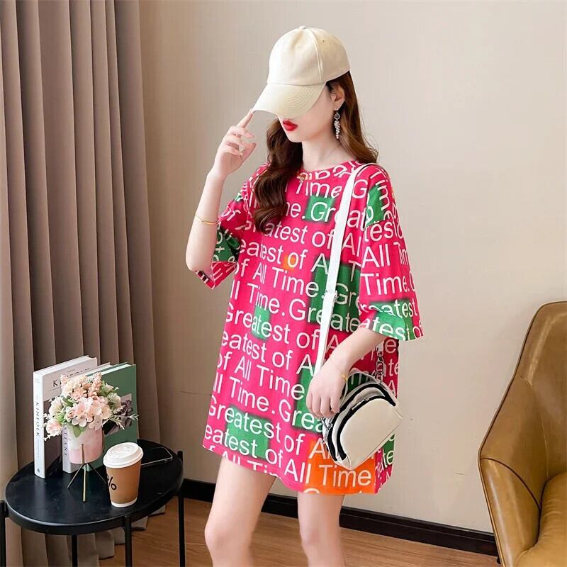 韓国スタイルレタープリントグラフィックトップスロング Tシャツ夏特大 Tシャツ原宿ピンクグリーン tシャツ かわいい サマー 夏物