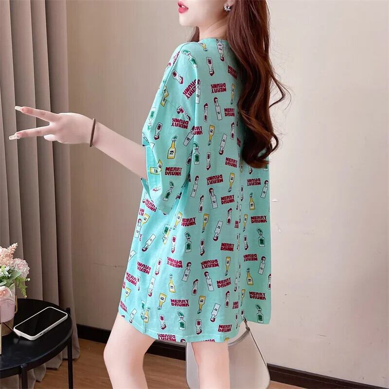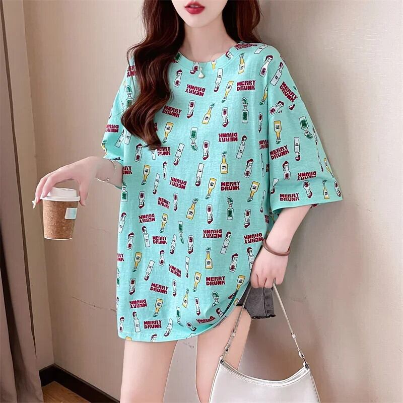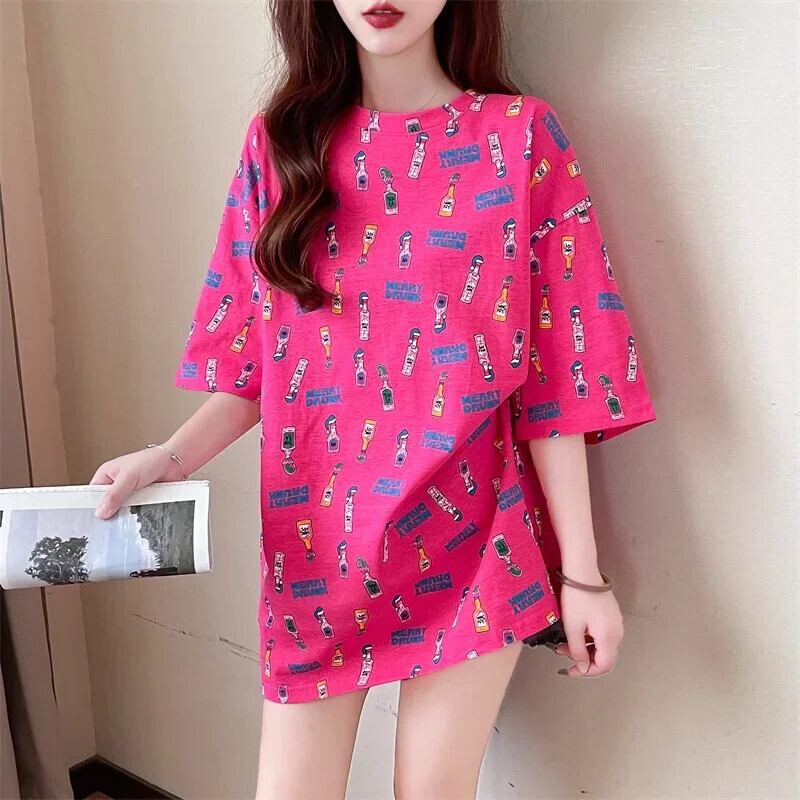 韓国スタイル面白いプリントグラフィック y2k トップスロング Tシャツ 2024 夏特大 Tシャツ原宿友人かわいい 大人ガーリー サマー 夏物