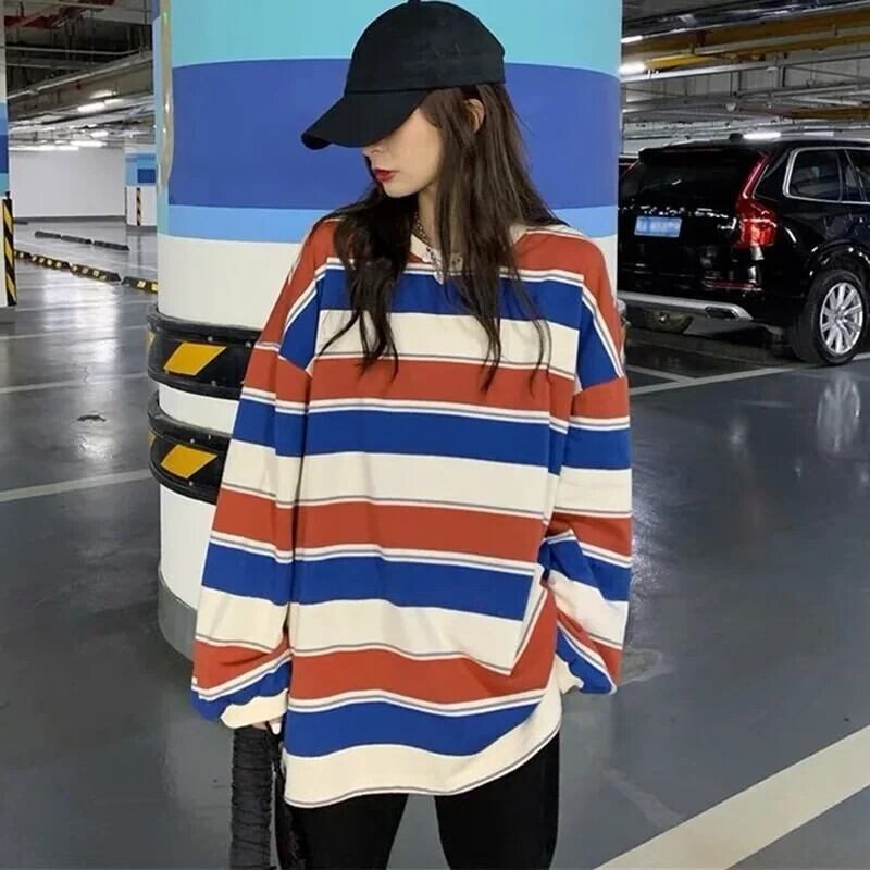 カップルマッチング長袖トップス春パーカーストライプ特大トレーナー原宿プルオーバーストリート ロング かわいい スプリング 春物