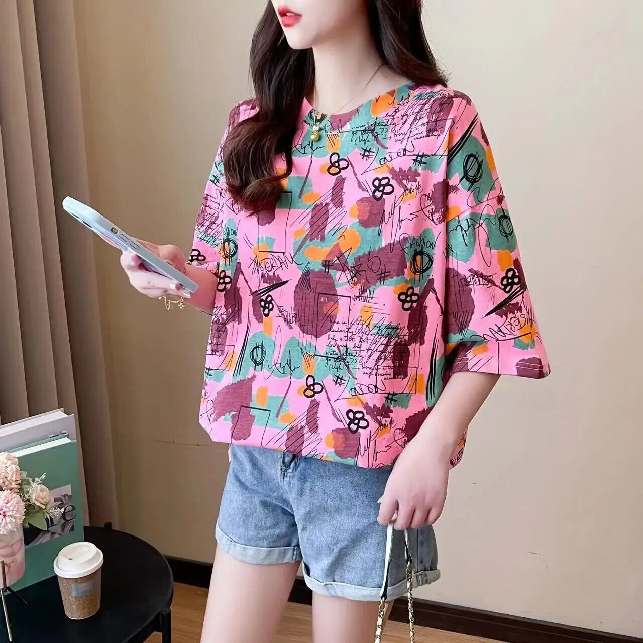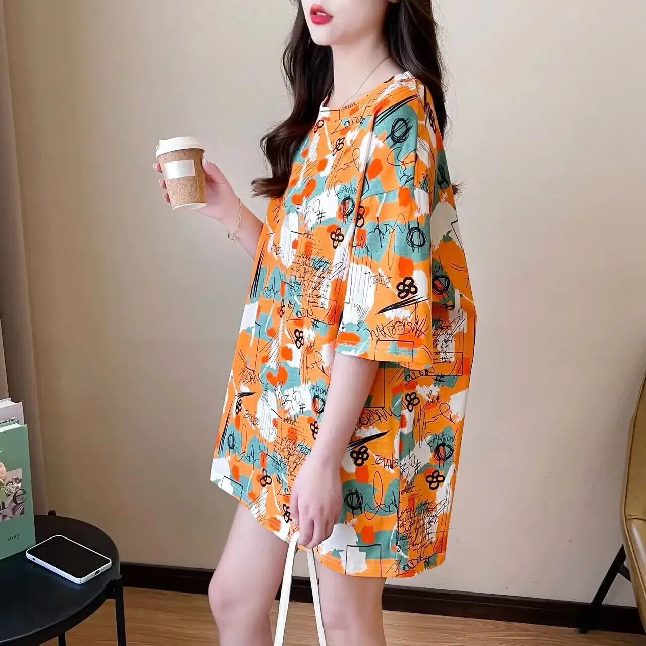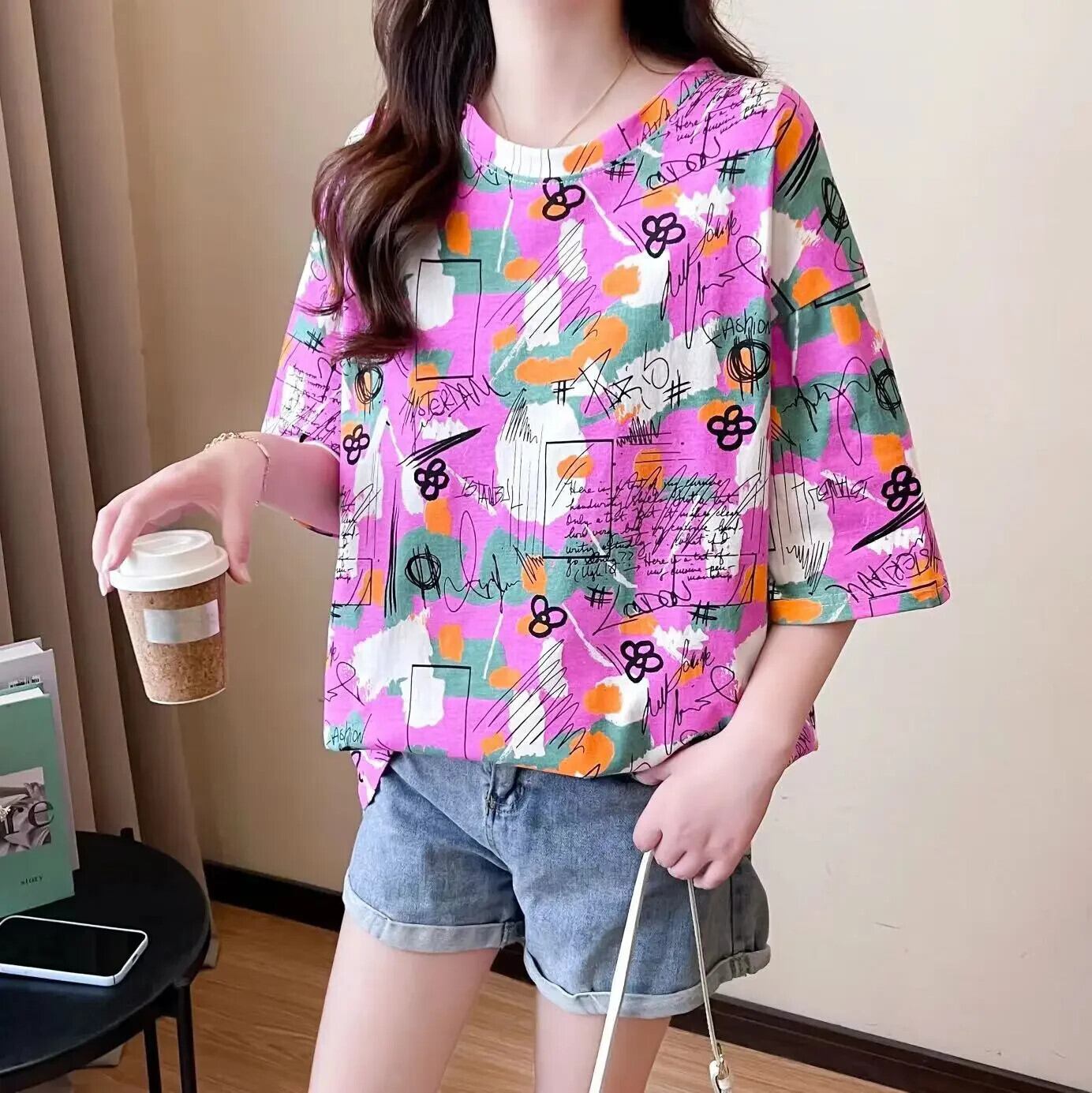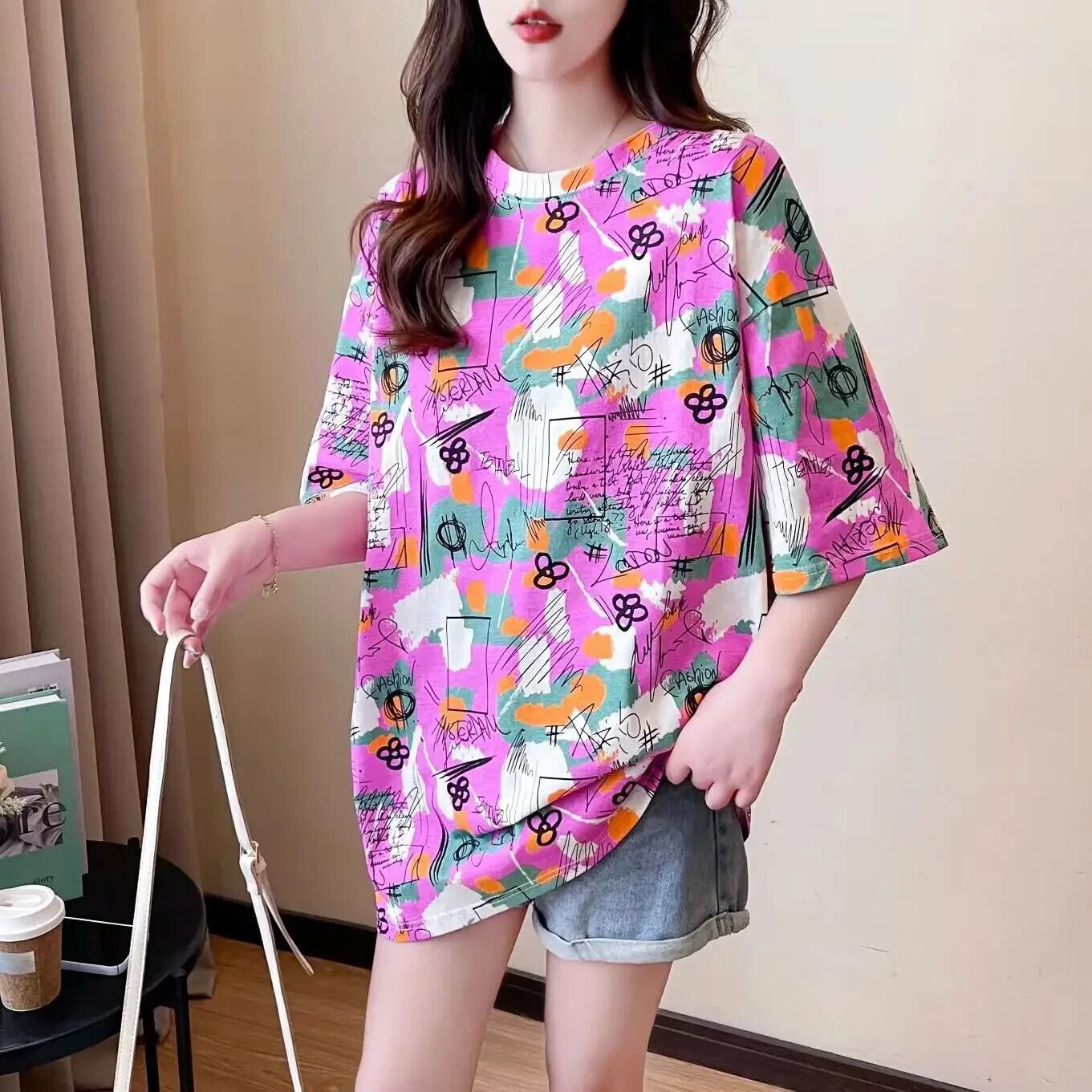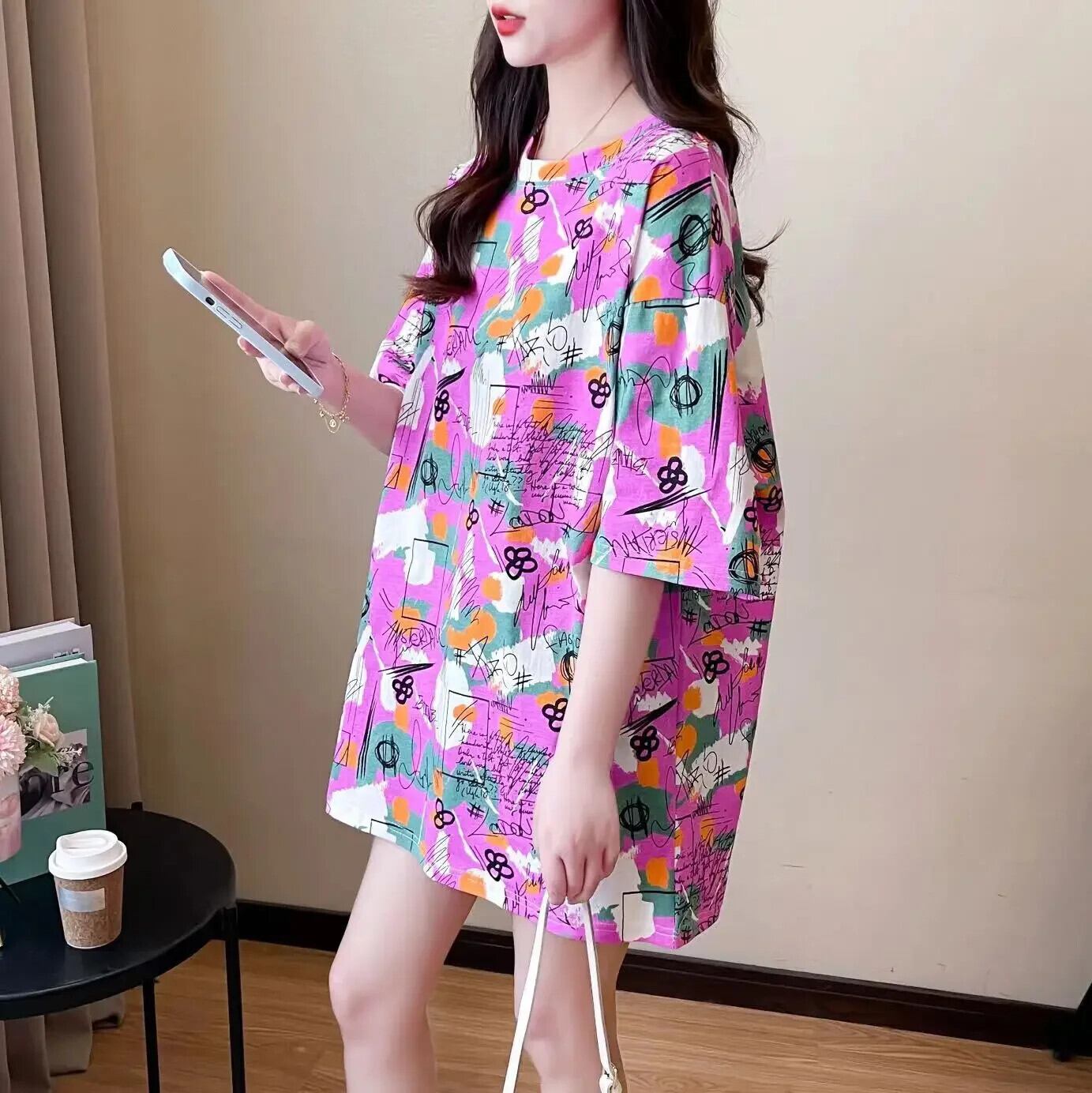 韓国プリントグラフィックトップスロング Tシャツ夏特大 Tシャツ原宿紫 tシャツヒップホップストリート かわいい サマー 夏物 パープル