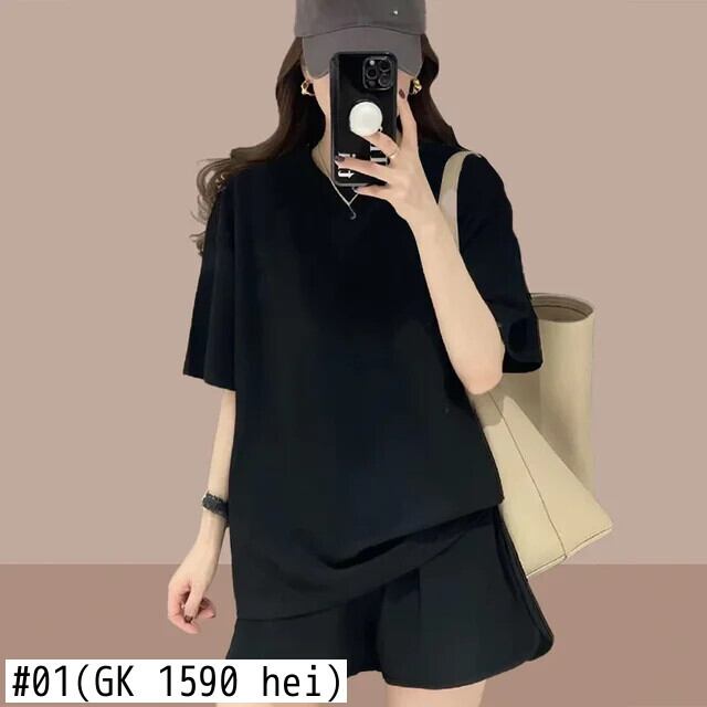 韓国シンプルルーズ半袖 O ネックトップス & ショーツパンツ 2 点セット 2024 夏スポーツセット無地スーツ ショート ハーフスリーブ サマー 夏物 ブルマー Oネック ソリッドカラー