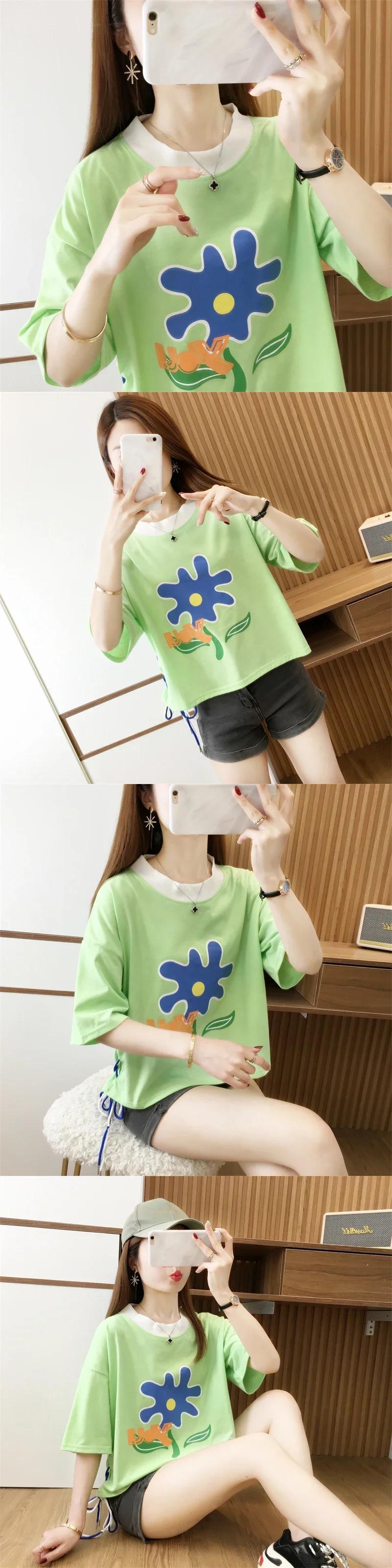 夏綿 tシャツファッション韓国スタイル花プリント Tシャツ半袖ラウンドネックピンククロップトップス若い ショート コットン ハーフスリーブ サマー 夏物 Oネック フラワーデザイン