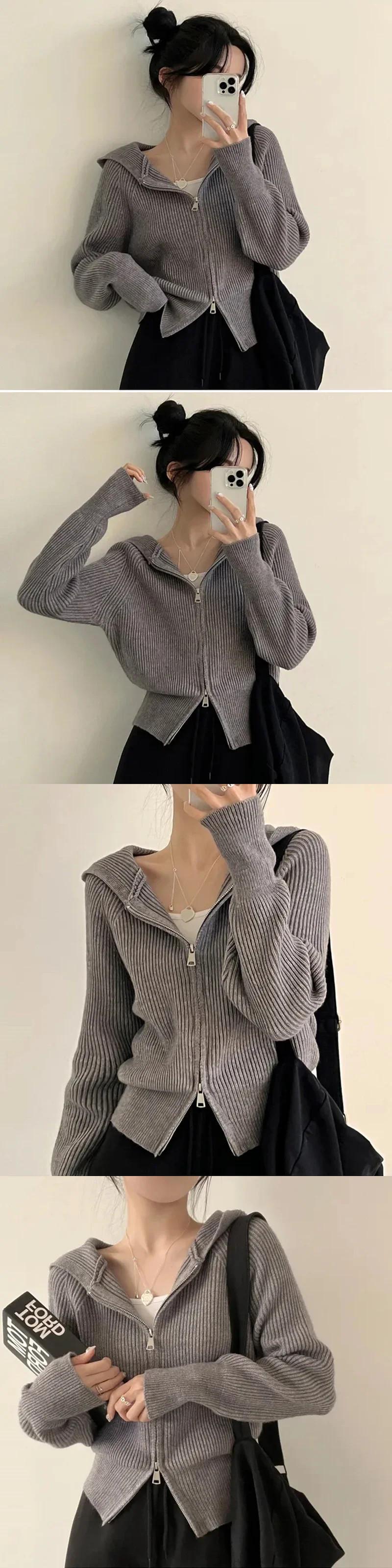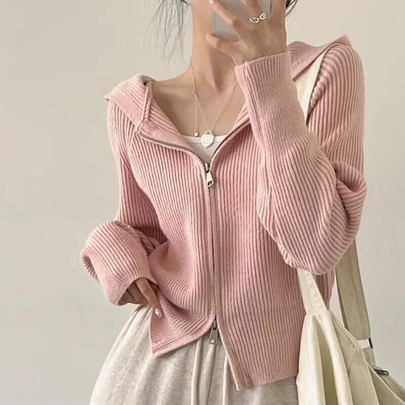 韓国長袖ピンクショートコートトップスセーター秋冬ジッパーニットカーディガンカジュアルルーズフード付きセーター ロング オータム 秋物 ウィンター 冬物 ソリッドカラー