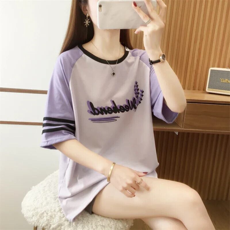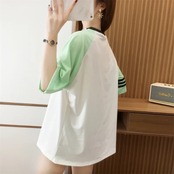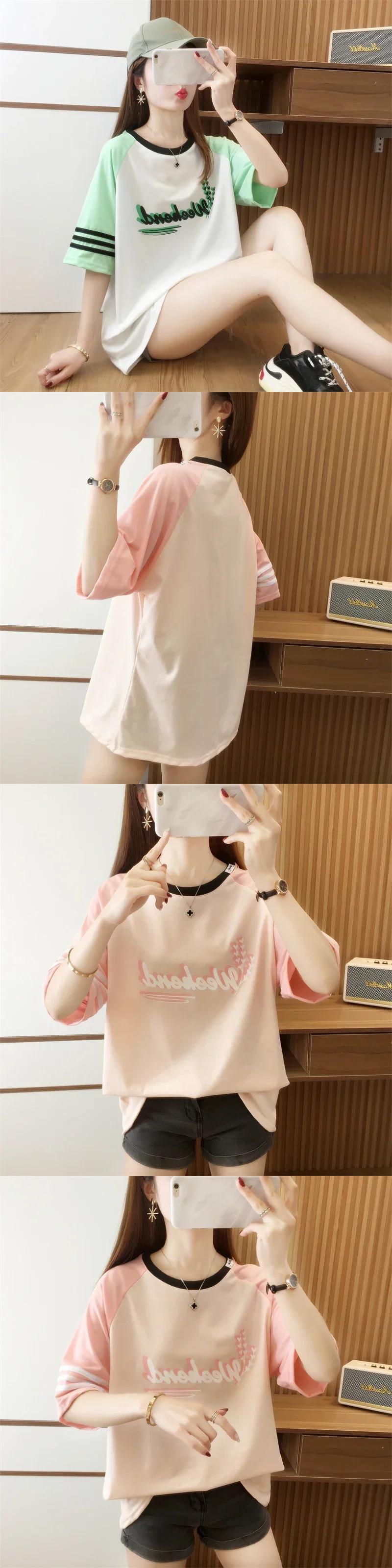 夏綿 tシャツファッション韓国ルーズレタープリントカラーブロック Tシャツ半袖ラウンドネック白 y2k トップス ショート ホワイト コットン ハーフスリーブ サマー 夏物 Oネック