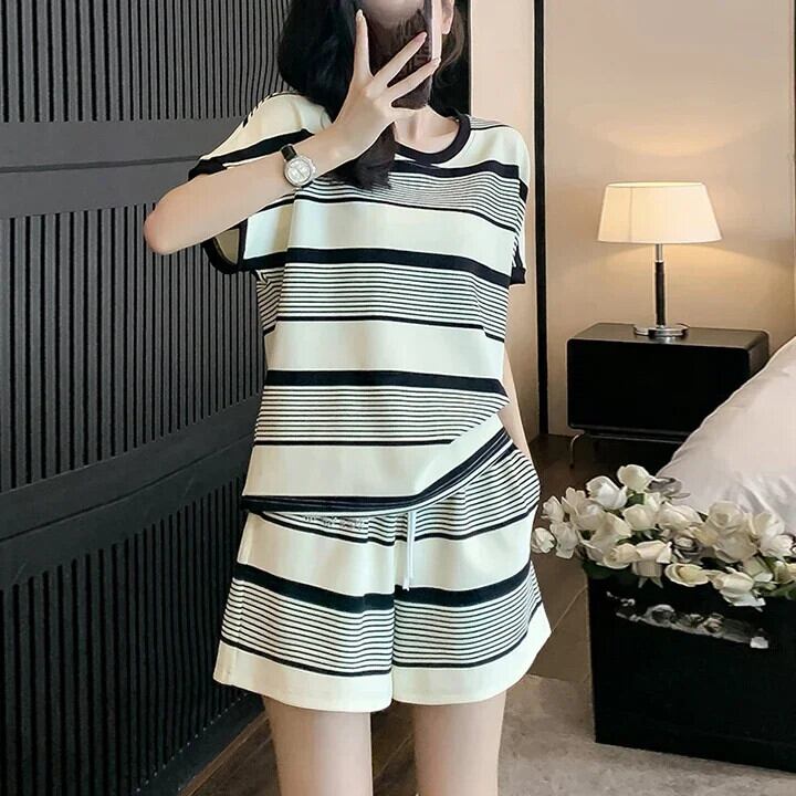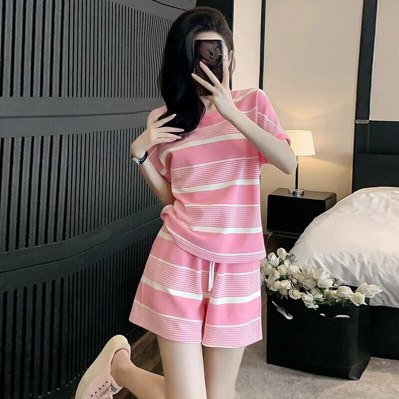 韓国ルーズ半袖 O ネックトップス & ショーツ 2 点セットレディース衣装夏ランニングスポーツセットストライプスーツ ショート ハーフスリーブ サマー 夏物 ブルマー Oネック
