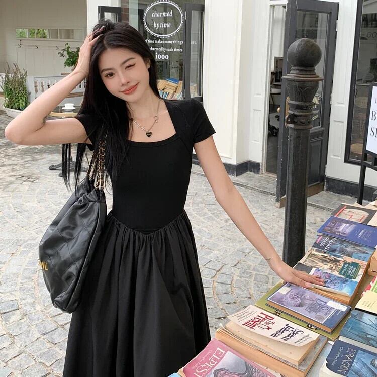 Aラインルーズドレスフレンチスタイルサマーブラックドレススクエアカラーウエストソリッドマキシボディコンドレス 夏物 ソリッドカラー スクウェア