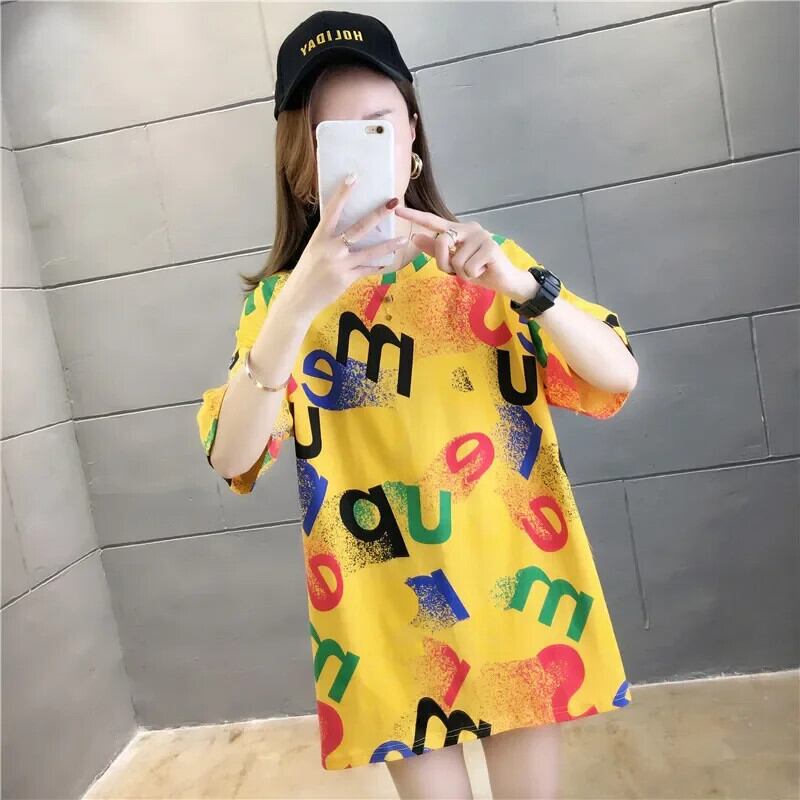 韓国黄色文字プリントグラフィックトップスロング Tシャツ夏特大 Tシャツ原宿 tシャツストリート かわいい サマー 夏物