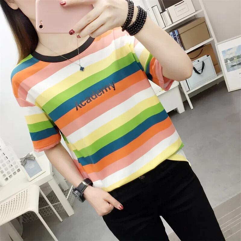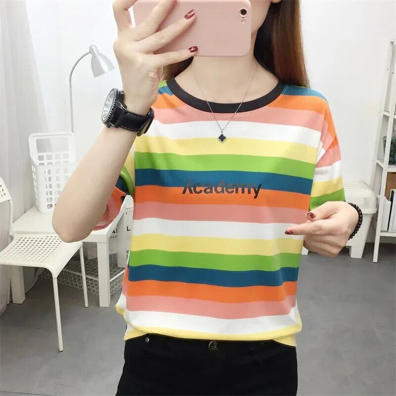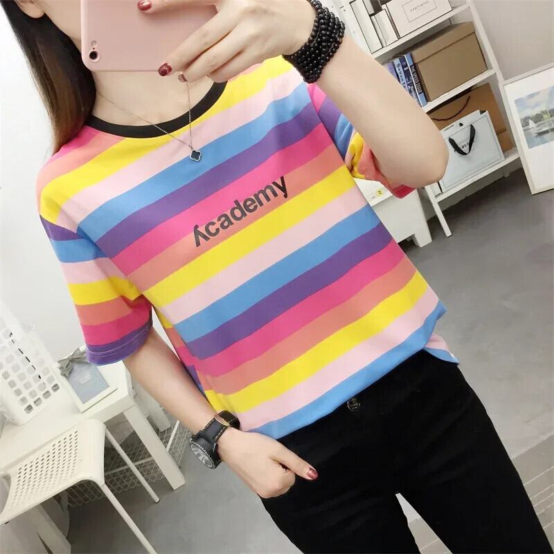 夏レインボーストライププルオーバー Tシャツ韓国ルーズ半袖 Tシャツトップストリート tシャツトップス ショート ハーフスリーブ サマー 夏物