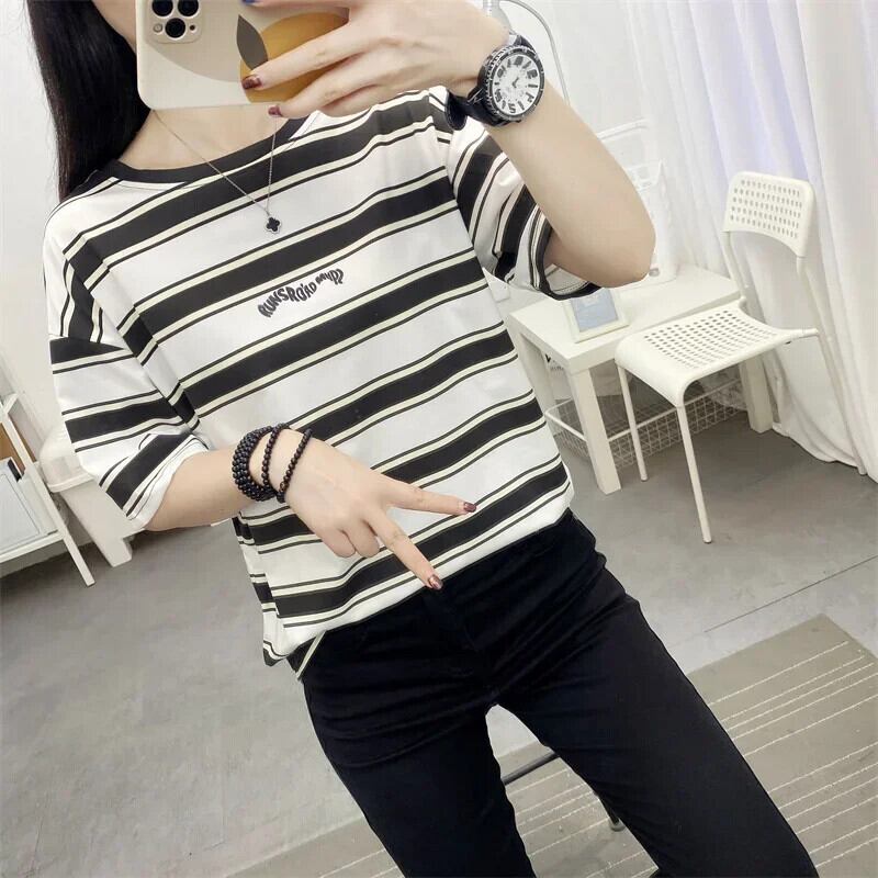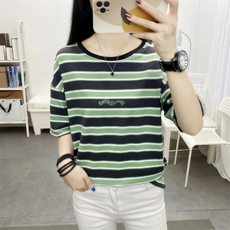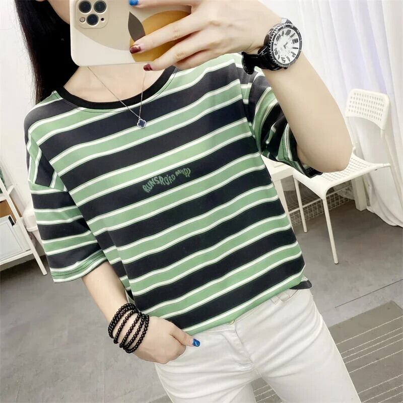 夏ストライププルオーバー Tシャツヴィンテージルーズ半袖 Tシャツトップストリートベース Tシャツレディトップス ショート ハーフスリーブ サマー 夏物 ビンテージ
