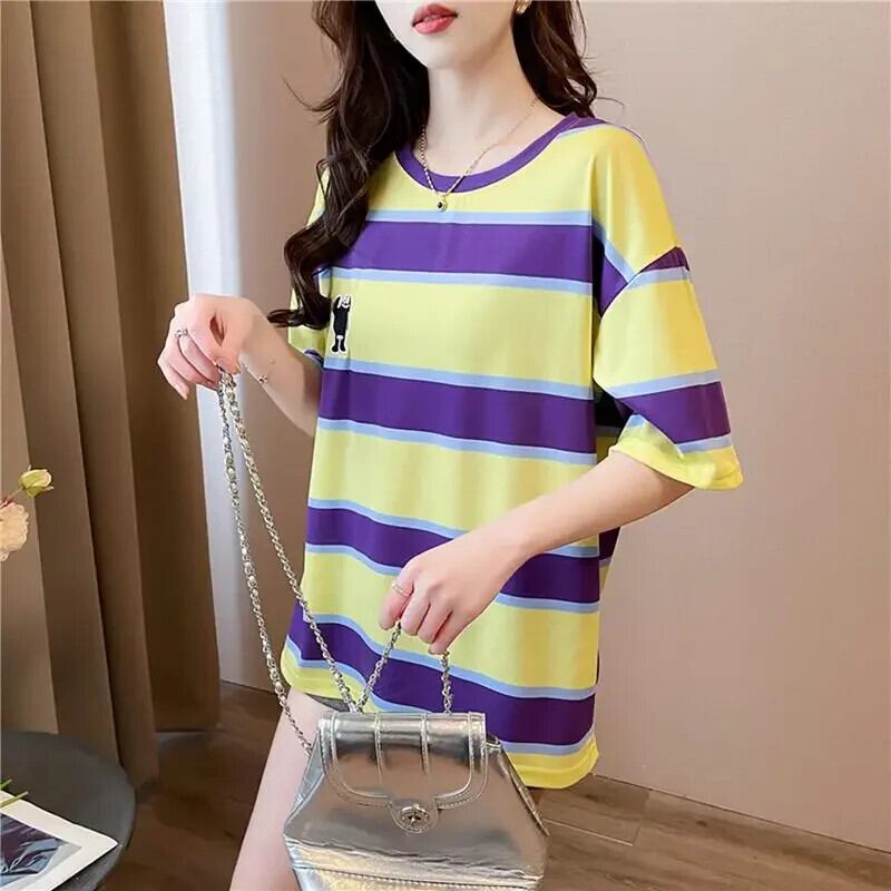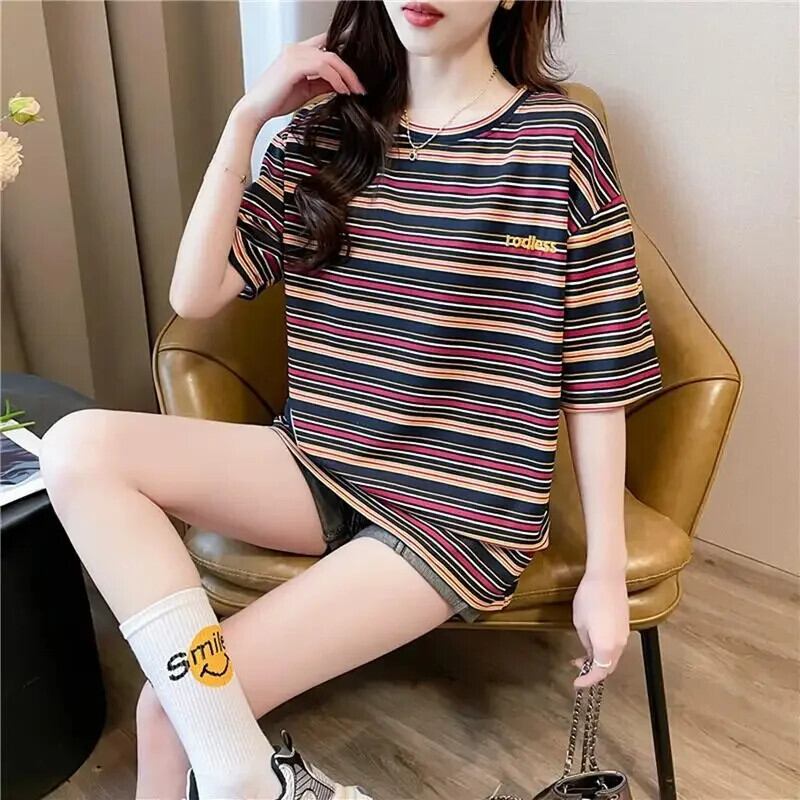夏 Tシャツ原宿かわいいレインボーストライプ Tシャツルーズシンプル Tシャツストリートグラフィックトップス 大人ガーリー スウィート キュート カジュアル サマー 夏物
