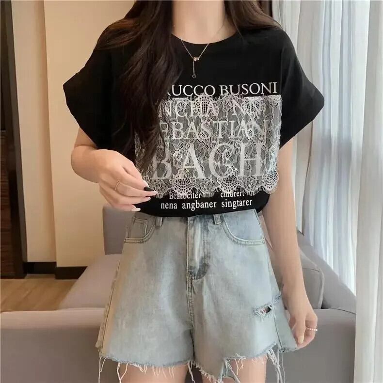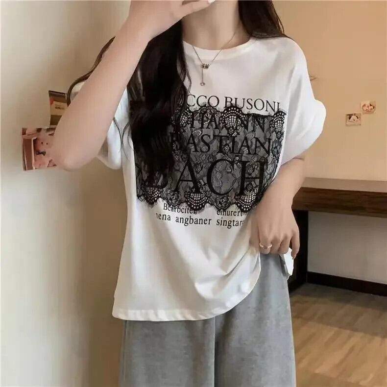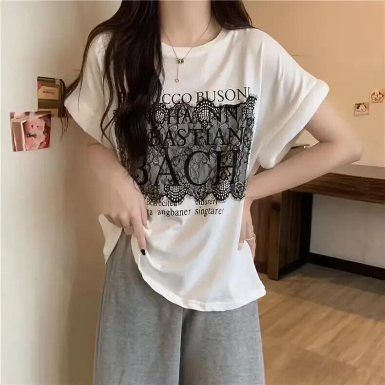 原宿ルーズレターソフト純粋綿 Tシャツ 2024 夏レーススプライシング Tシャツストリート コットン かわいい サマー 夏物 ピュア