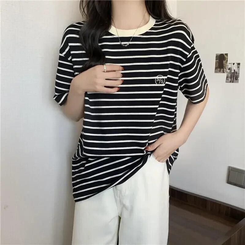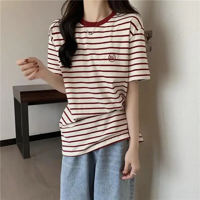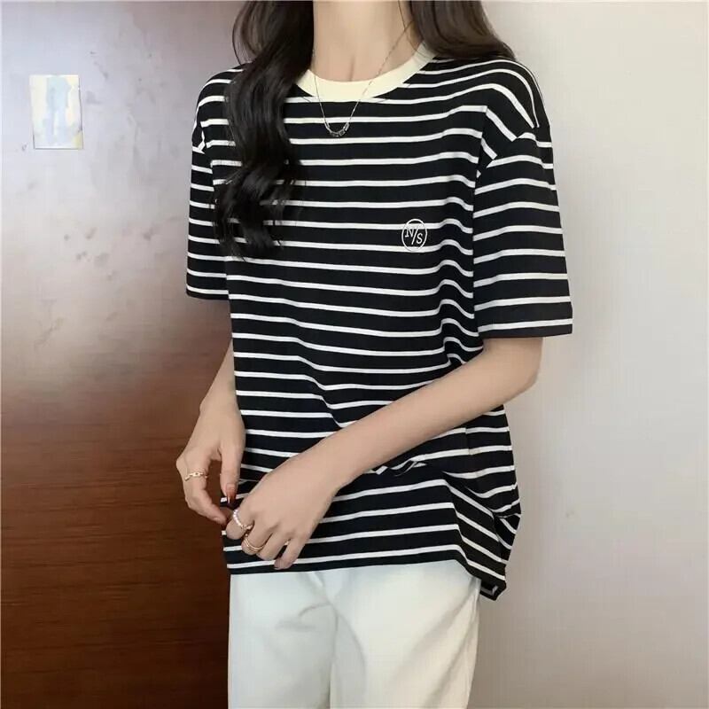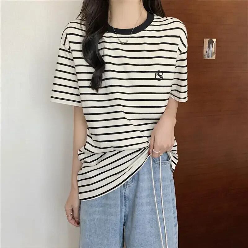 原宿ルースコットン Tシャツ 2024 夏ストライプ Tシャツ文字刺繍 Tシャツストリート かわいい サマー 夏物