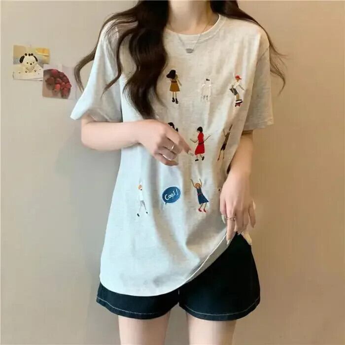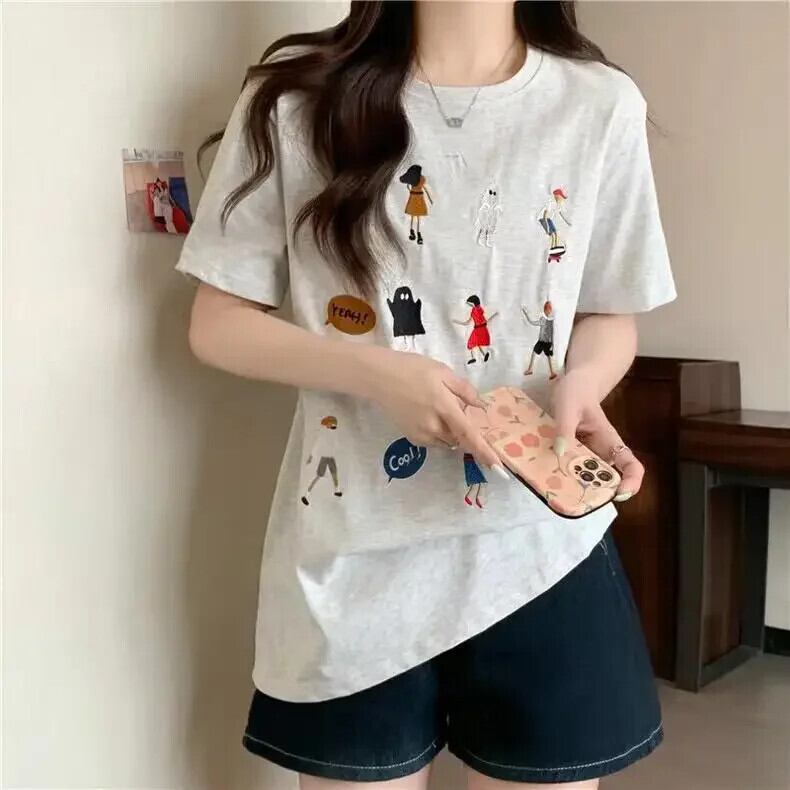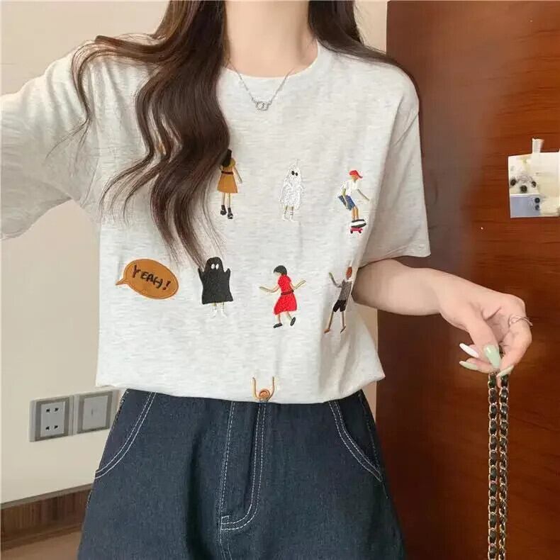 原宿ルース純粋綿 Tシャツ夏 Tシャツおかしい漫画刺繍 Tシャツストリート コットン かわいい サマー 夏物 ピュア