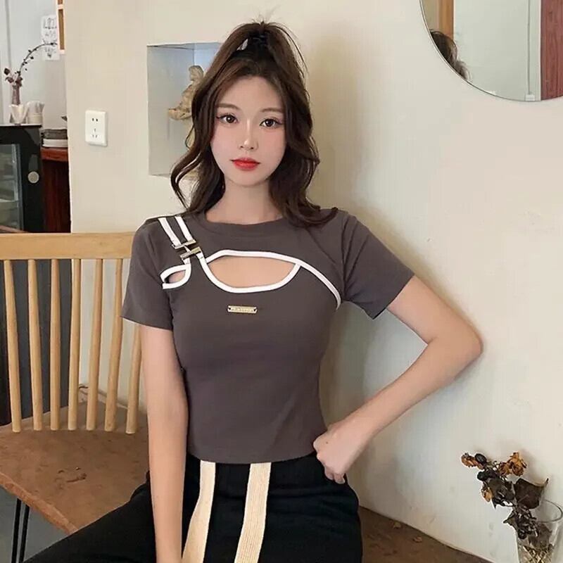 ショートトップスリムセクシーブラックホワイトクロップトップスメタルバックルフェイクツーピース半袖Tシャツ ハーフスリーブ