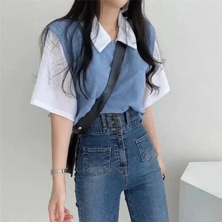 夏アカデミースタイルトップスカラーブロッキングポロ襟偽ツーピース半袖 Tシャツルーズ y2k トップ学生 tシャツ ショート ハーフスリーブ サマー 夏物
