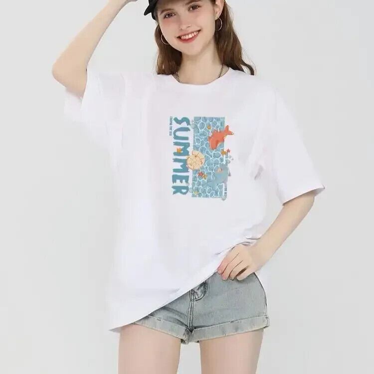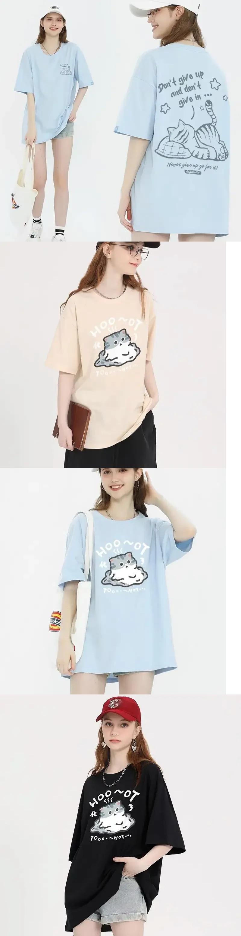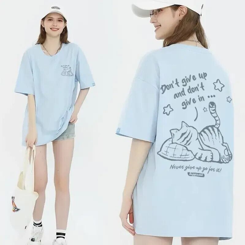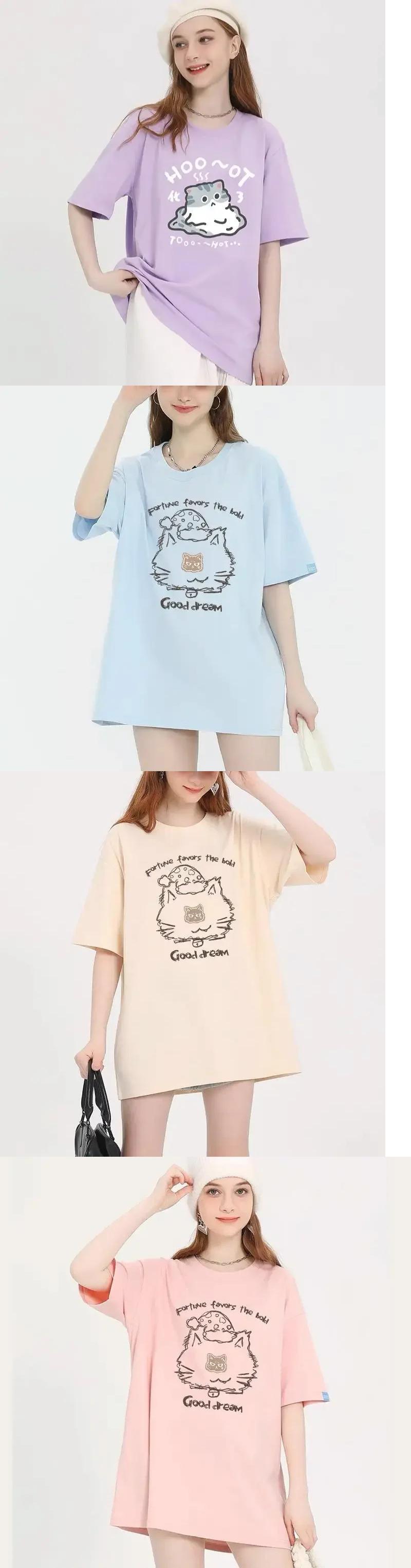 夏漫画プリント純粋綿ストリート Tシャツ原宿特大半袖 Tシャツピンク Y2k トップス ショート コットン ハーフスリーブ かわいい サマー 夏物 ピュア