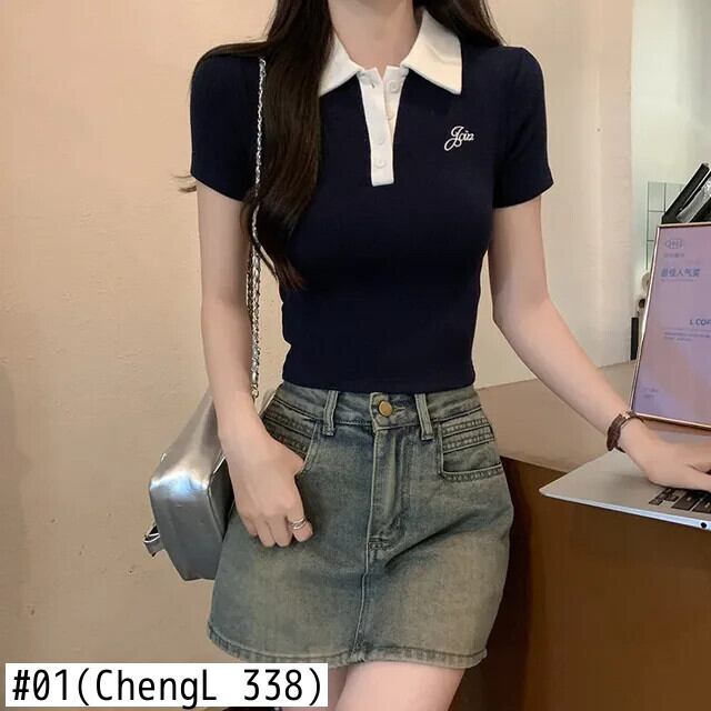 夏カラーマッチング tシャツ原宿半袖純粋綿黒 Tシャツカジュアルスリムポロ襟 y2k クロップトップ ショート ブラック コットン ハーフスリーブ かわいい サマー 夏物 ピュア
