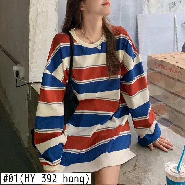 原宿ストライププリントラウンドネック特大プルオーバー y2k トップス春秋長袖 Tシャツユニセックスストリート ロング かわいい スプリング 春物 オータム 秋物 Oネック