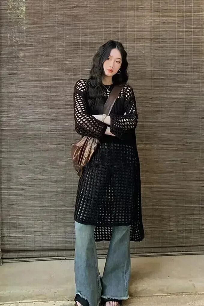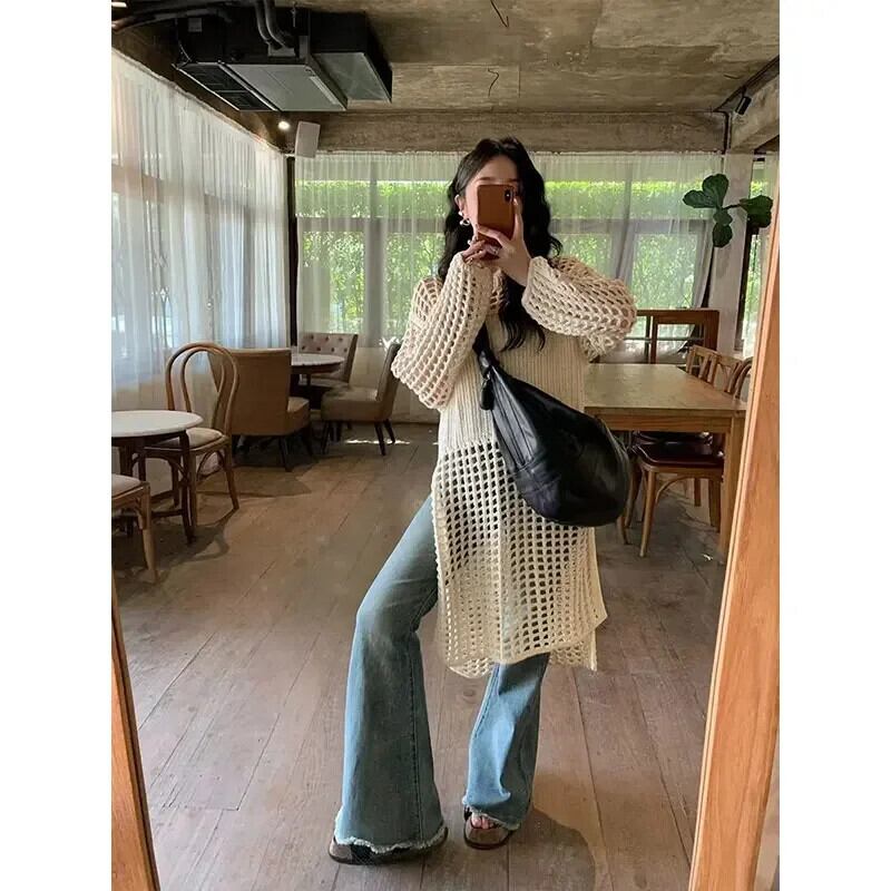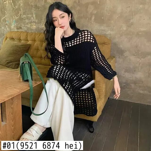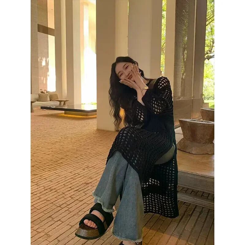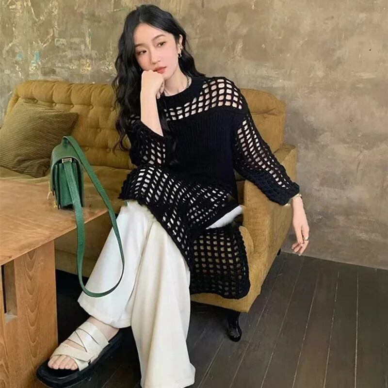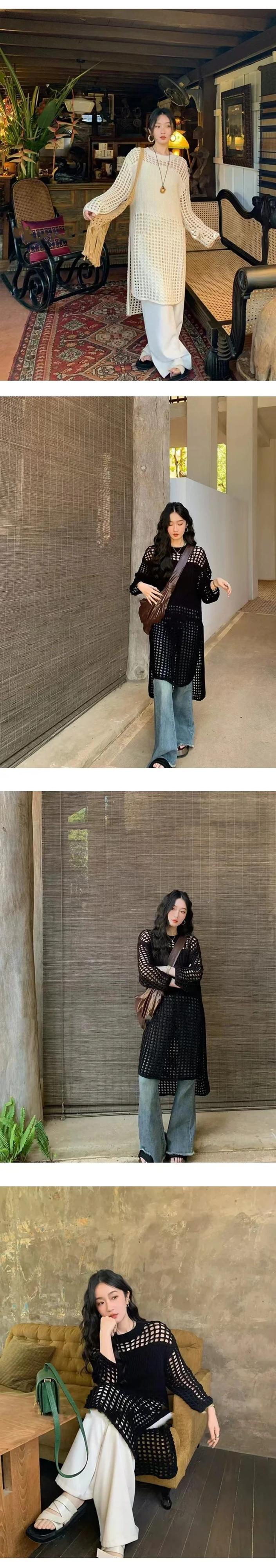 夏秋スモックドレスニットセータードレスレディアウトメッシュプルオーバーシースルールック長袖ルーズトップス ロング サマー 夏物 オータム 秋物