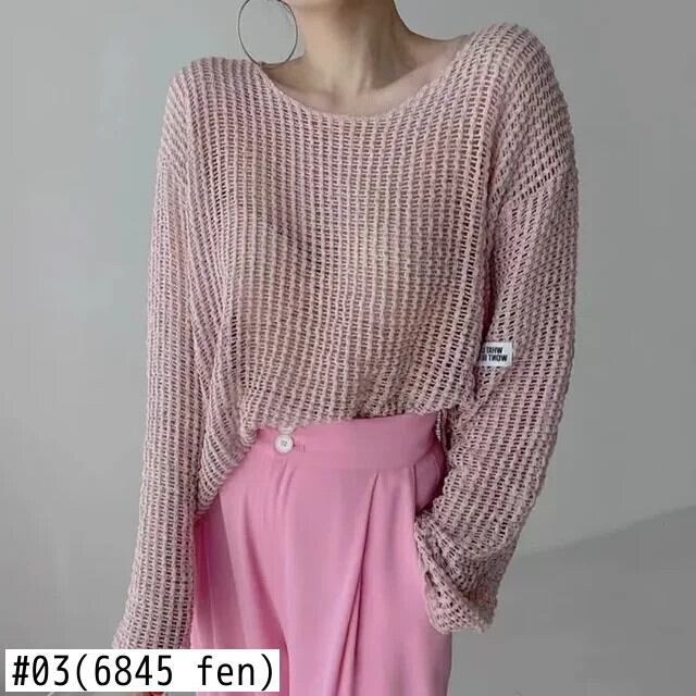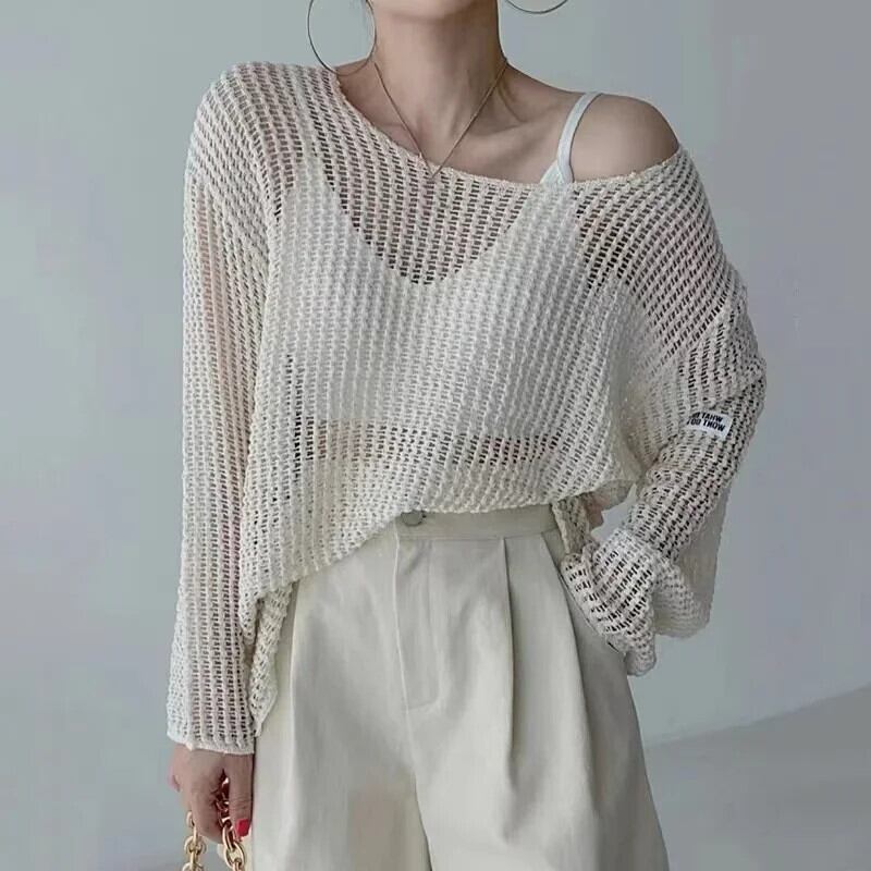 夏アウトメッシュ薄型プルオーバーニットセーターシースルールック長袖ルーズトップススモック日焼け止めシャツ ロング サマー 夏物