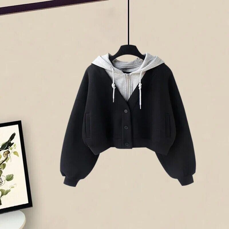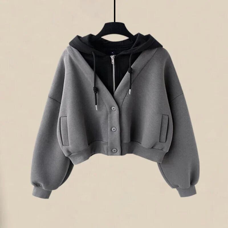 Herbst Baumwolle gefälschte zweiteilige Reiß verschluss übergroße スウェットシャツ Frauen lässige パーカー原宿 Langarm Kapuze kurze Jacken Mantel かわいい